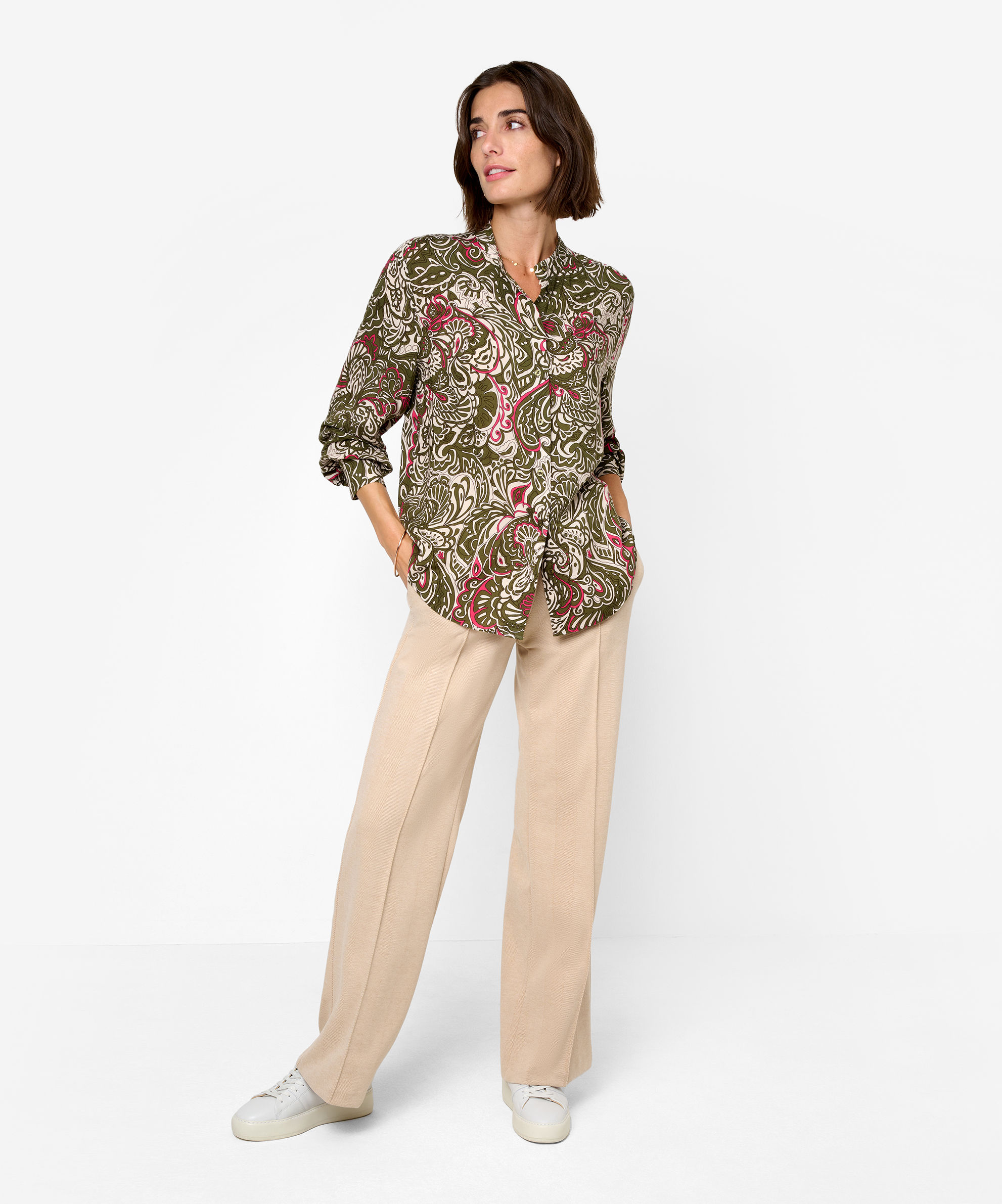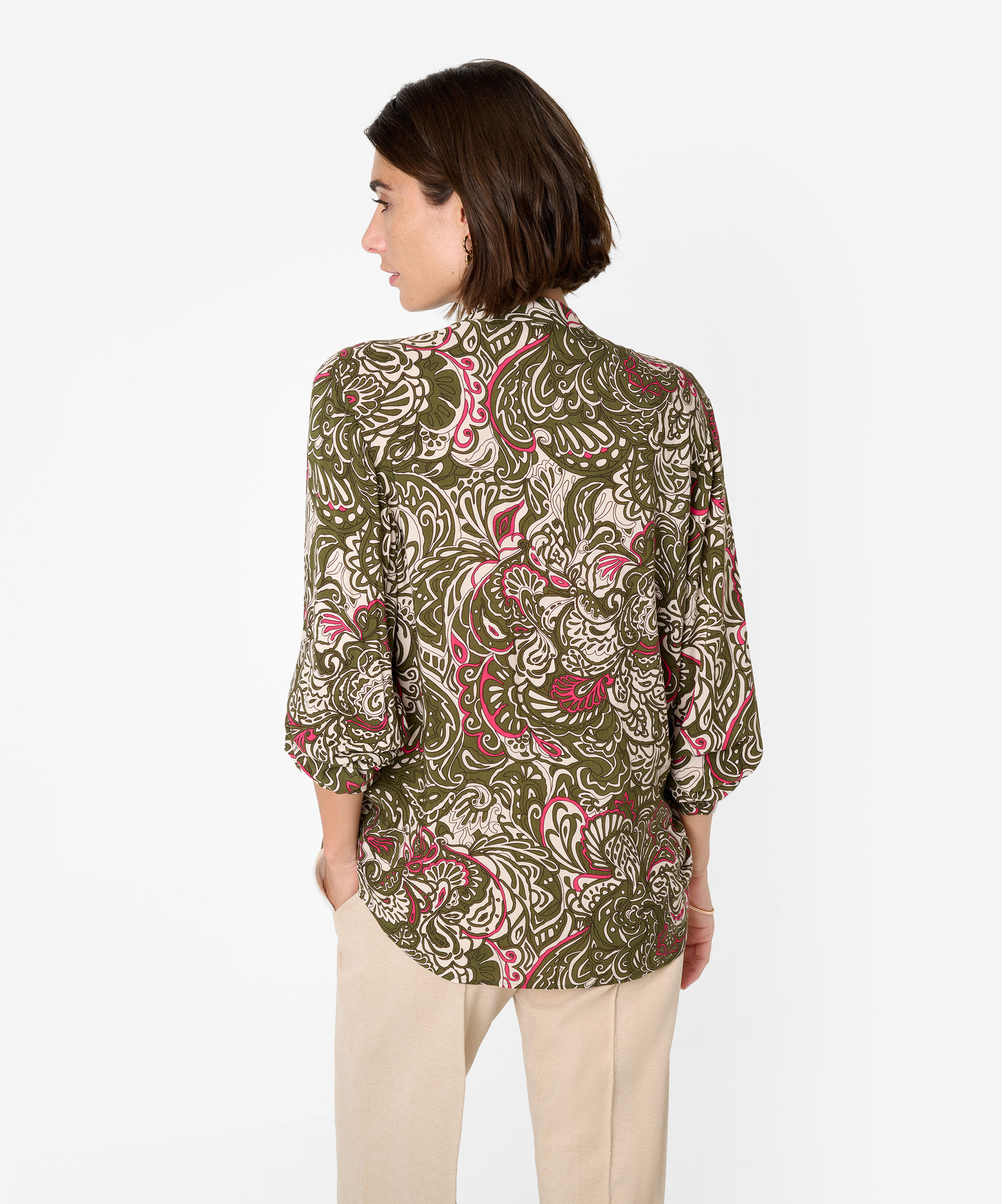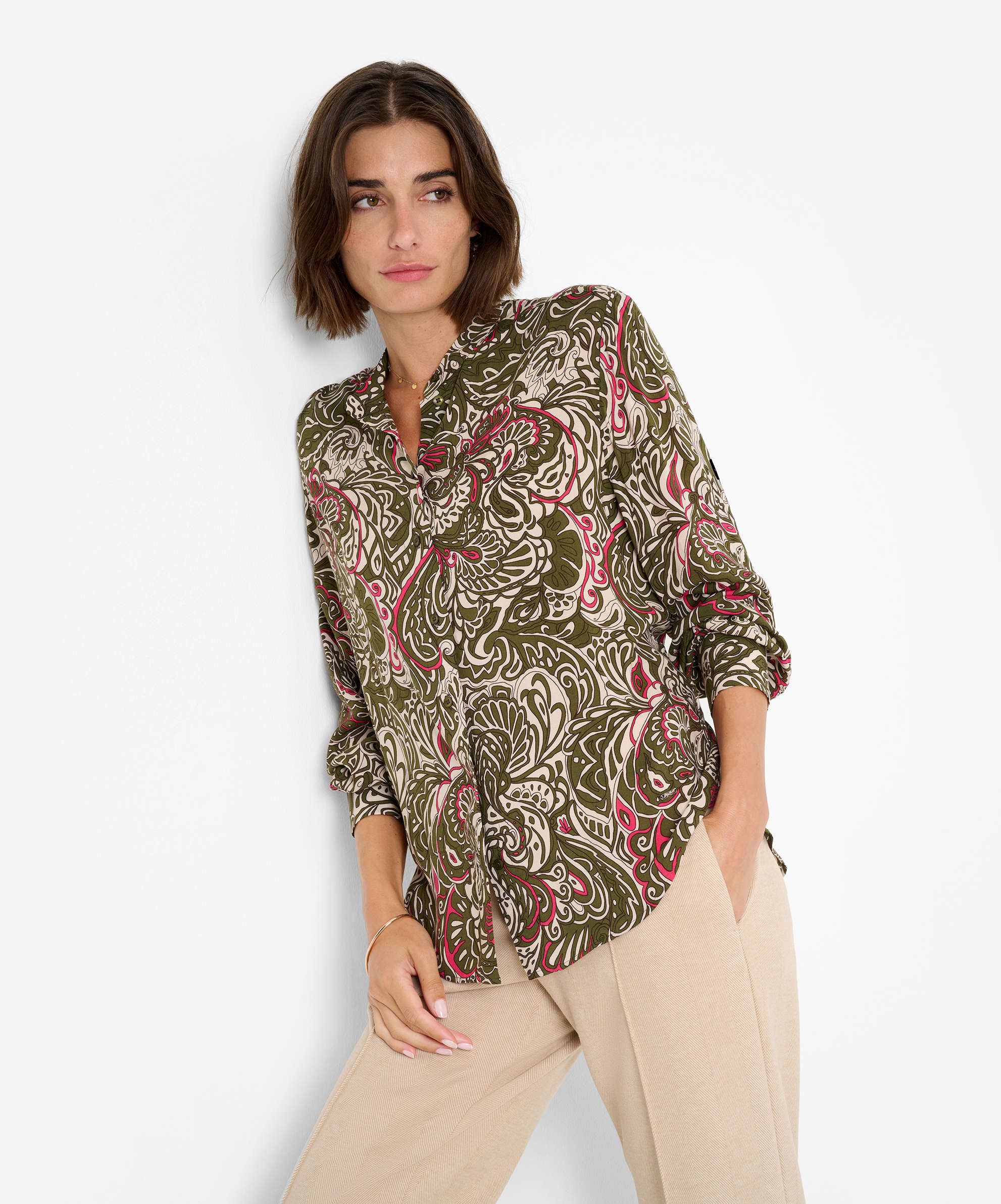 Elegant und zeitgemäß präsentiert sich die Bluse Style Viv. Ihre weite Silhouette geht harmonisch in einen leicht gerundeten Saum über und wird durch das verlängerte Rückenteil zusätzlich betont. Der auffällige Allover-Print und ein moderner Stehkragen verleihen der Bluse eine besondere Note. Den perfekten Abschluss macht die 2-Knopf Manschette an den gekräuselten Ärmelbündchen. Gefertigt aus reiner Viskose, verspricht diese Bluse für Damen nicht nur einen attraktiven Look, sondern auch höchsten Tragekomfort und Weichheit. Ein modernes Essential für Ihre feminine Garderobe.Form: