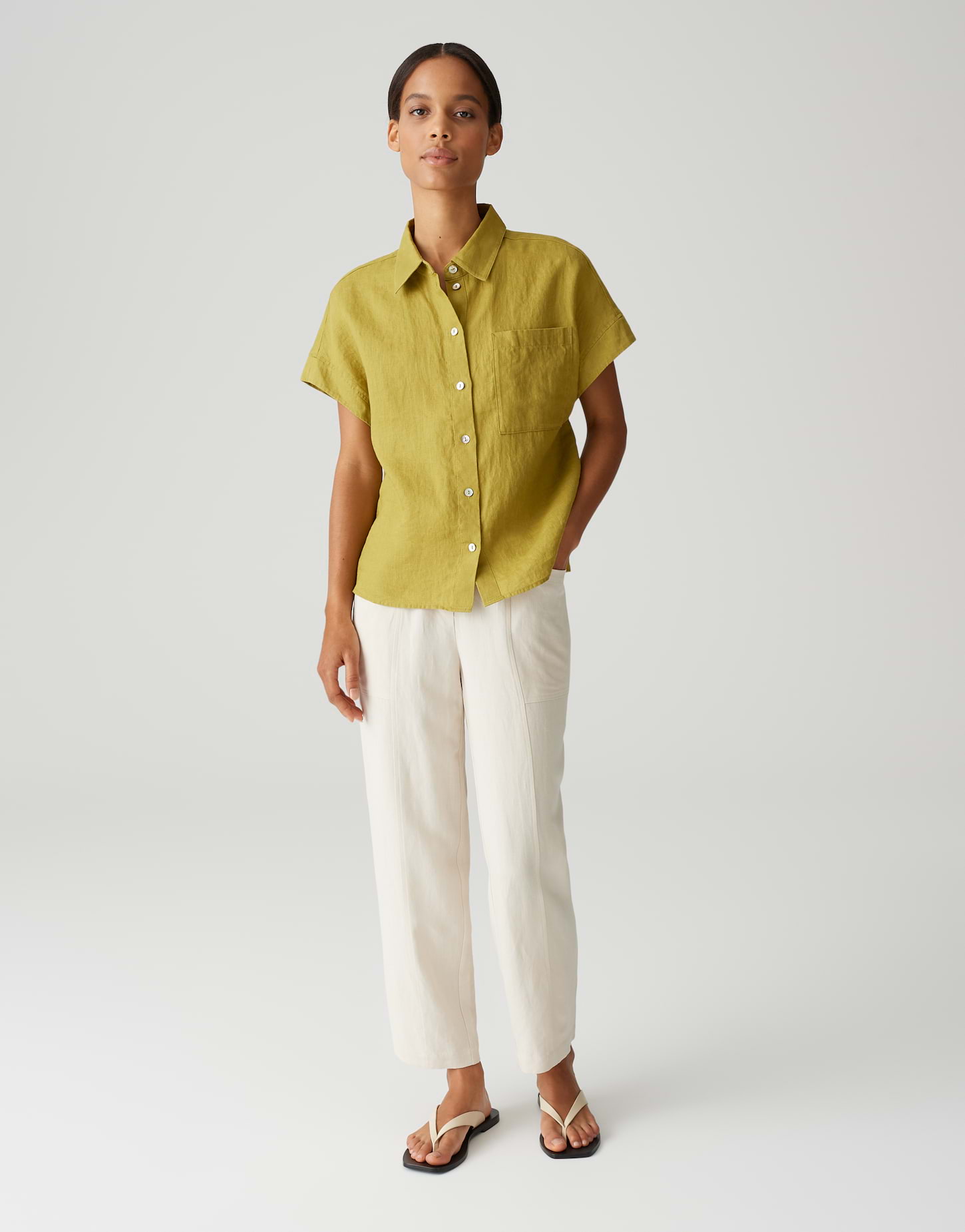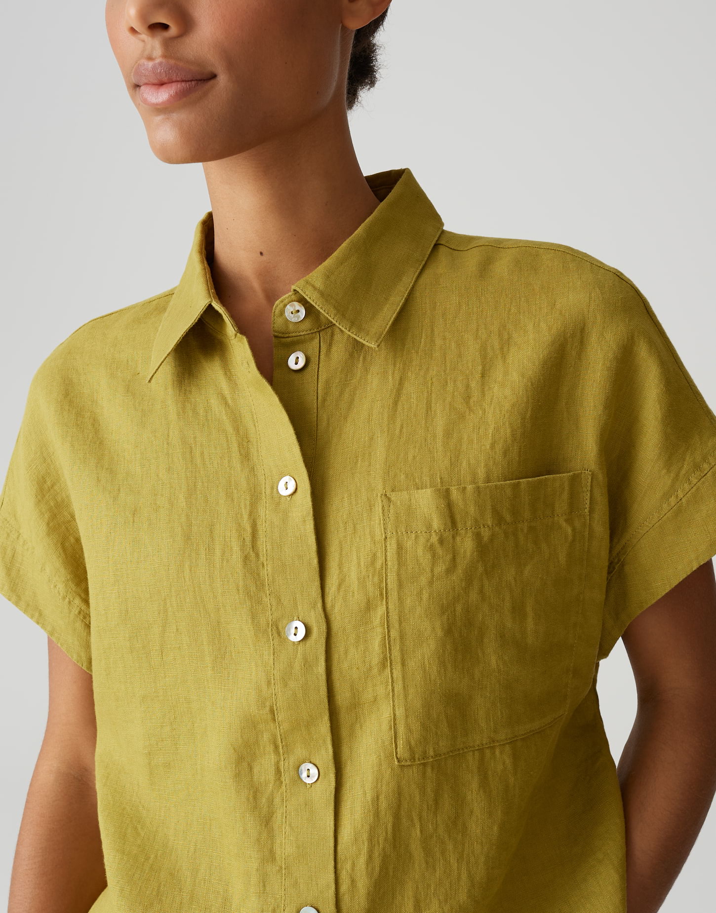 weite Passform, gerader Schnitt, normale Länge, überschnittener Kurzarm, Hemdblusenkragen, Rückenlänge ca. 59 cm bei Größe 36, Model Größe 176 cm – trägt Größe 36, Webware, enthält nichttextile Teile tierischen Ursprungs, natürliche Leinenstruktur, natürlicher Griff, atmungsaktiv, kühlender Effekt, aufgesetzte Brusttasche, lange Knopfleiste, Perlmuttknöpfe, Passe im Rücken