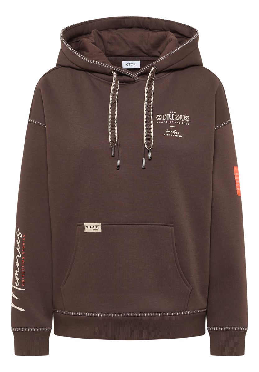 Dieser Kapuzenpullover von CECIL setzt modische Akzente mit dekorativen Nähten in Kontrastfarbe, Artwork auf der Brust und Wording am Ärmel. Tunnelzug mit doppelten Strings und Kängurutasche unterstreichen den sportiven Charakter. Der Baumwollmix sorgt für angenehmen Tragekomfort – ein echtes Highlight für deinen Casual-Style. Sweatshirt Casual Kapuze Langarm Lässig und sportiv Material: 55% Baumwolle, 45% Polyester