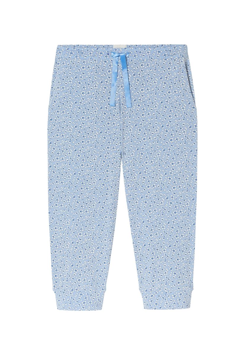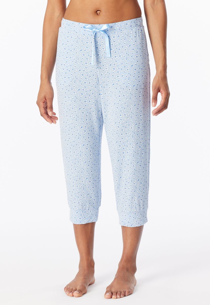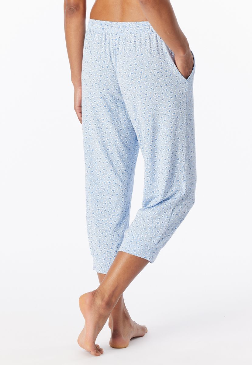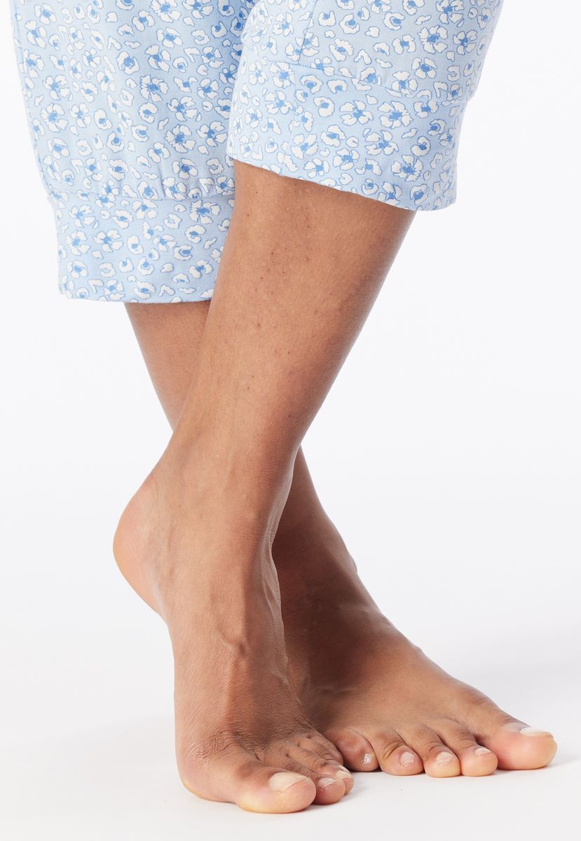 3/4-lange Damenhose in Hellblau mit Blumenmuster in Leopardenoptik, aus der beliebten SCHIESSER Serie „Mix+Relax“, praktische Seitentaschen und breite Beinabschlüsse, elastischer Bund mit Satin-Bindeband, ideal zum Kombinieren mit anderen Artikeln aus der Mix+Relax Serie!, unsere Models tragen Größe 38/M, in angenehm weicher, elastischer Single-Jersey-Qualität mit Modal