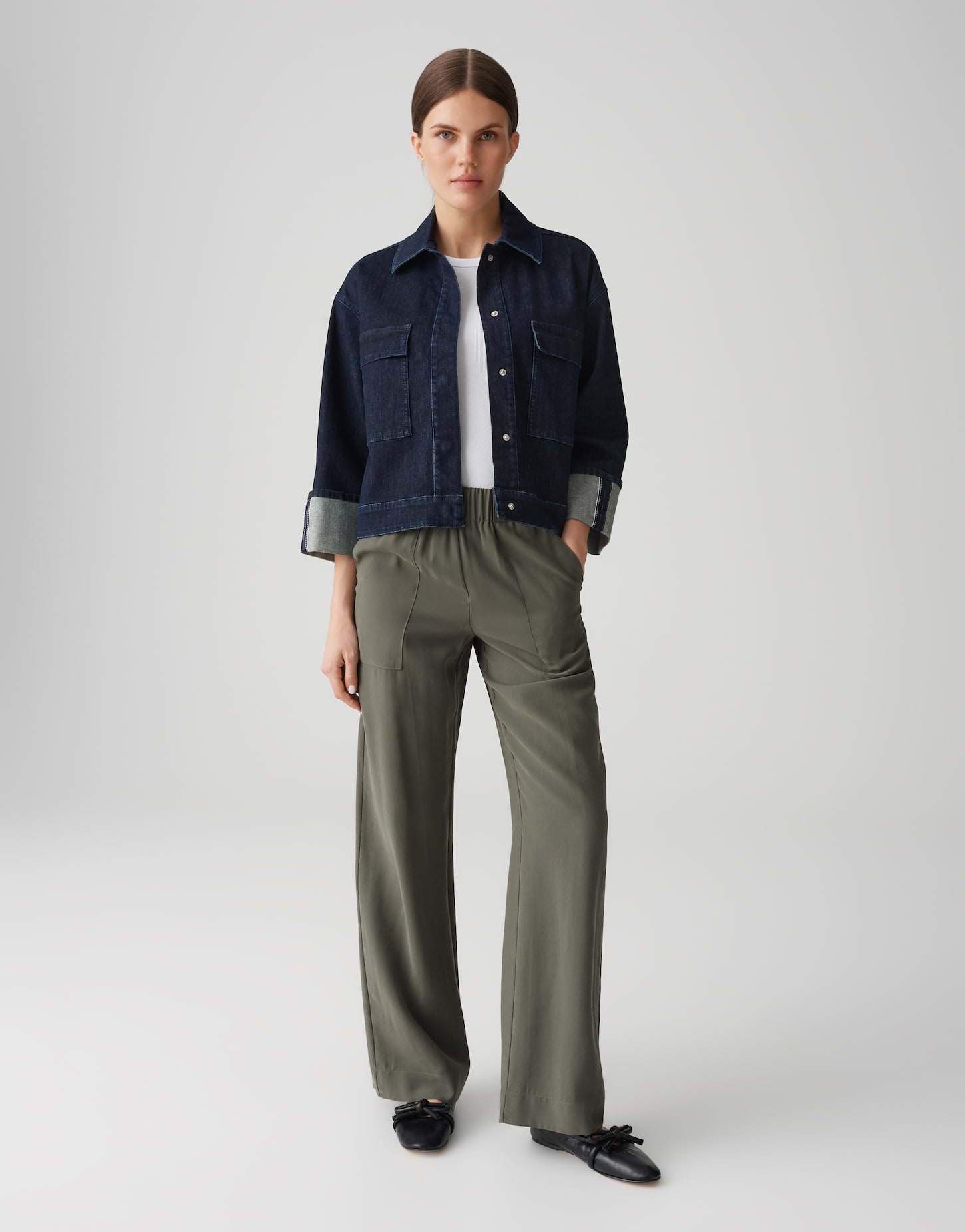 lockere Passform, Boxy Schnitt, verkürzte Länge, überschnittene Schulter mit 3/4 Arm, Umlegekragen, Rückenlänge ca. 55 cm bei Größe 36, Model Größe 175 cm – trägt Größe 36, Denim, ungefüttert, natürlicher Griff, elastischer Stoff, authentische Waschung, aufgesetzte Pattentaschen, breiter Saum, verdeckte Knopfleiste, metallische Druckknöpfe, XL-Aufschlag am Ärmelsaum