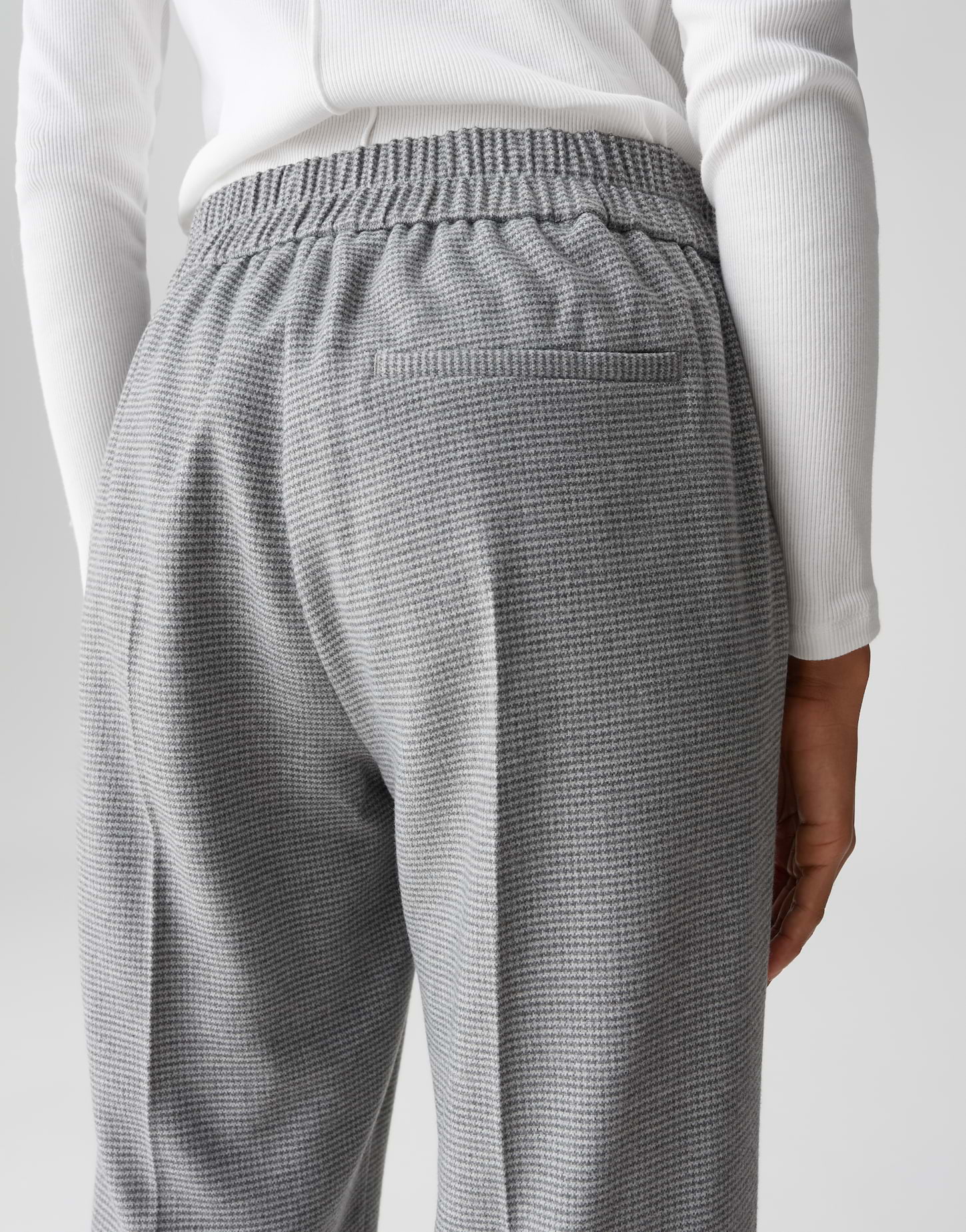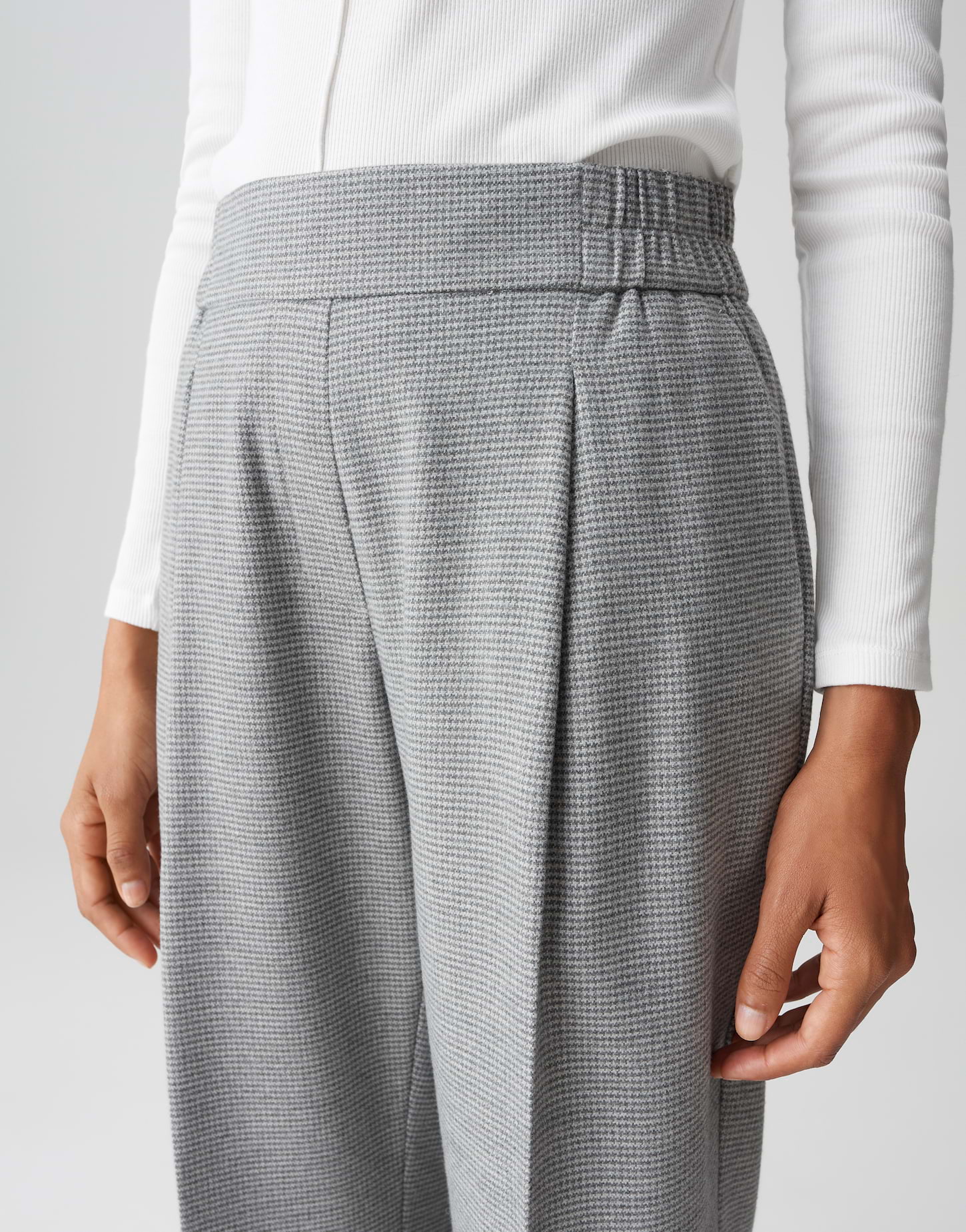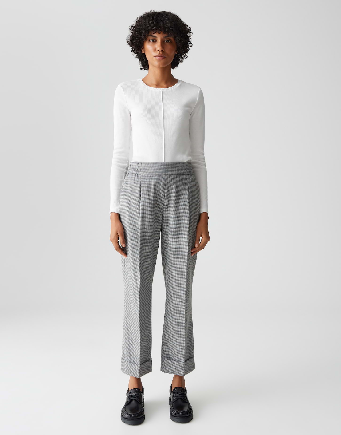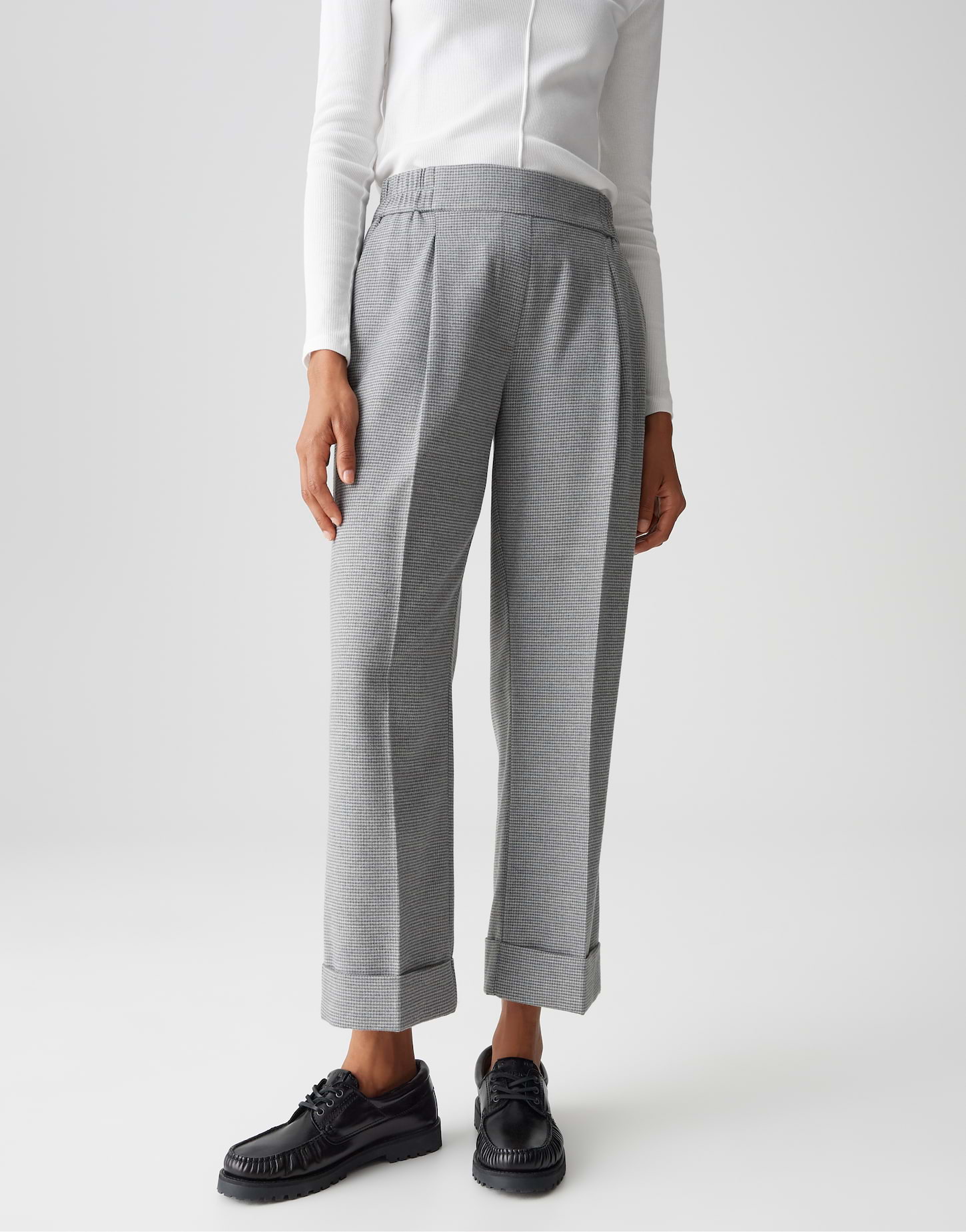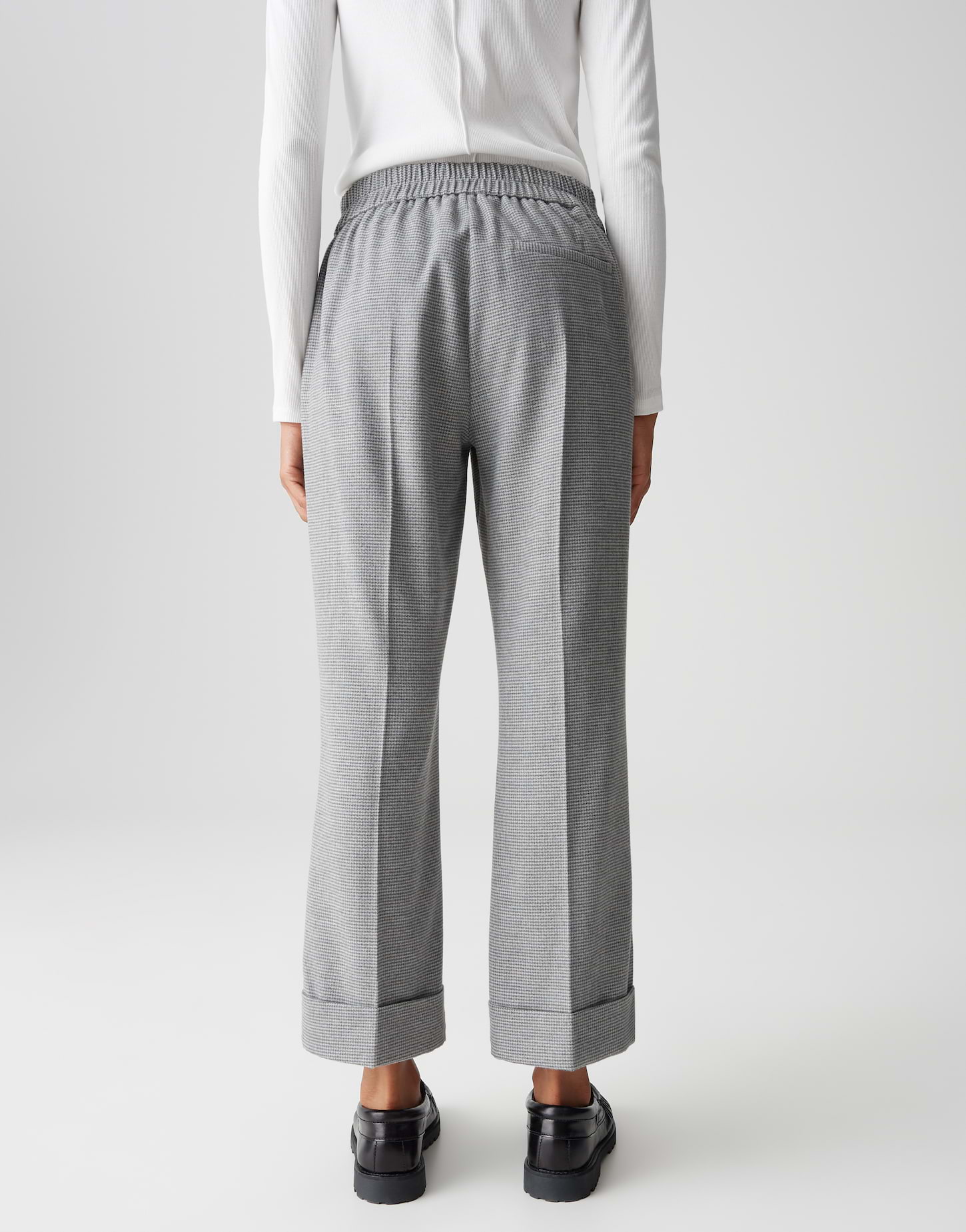 Das feine Pepitamuster verleiht Retro Chic und verschmilzt mit eleganten Bund- und Bügelfalten zu einem modernen Business Statement. Ein breiter Aufschlag am Saum rundet den Look mit lässiger Klasse und modischer Raffinesse ab.