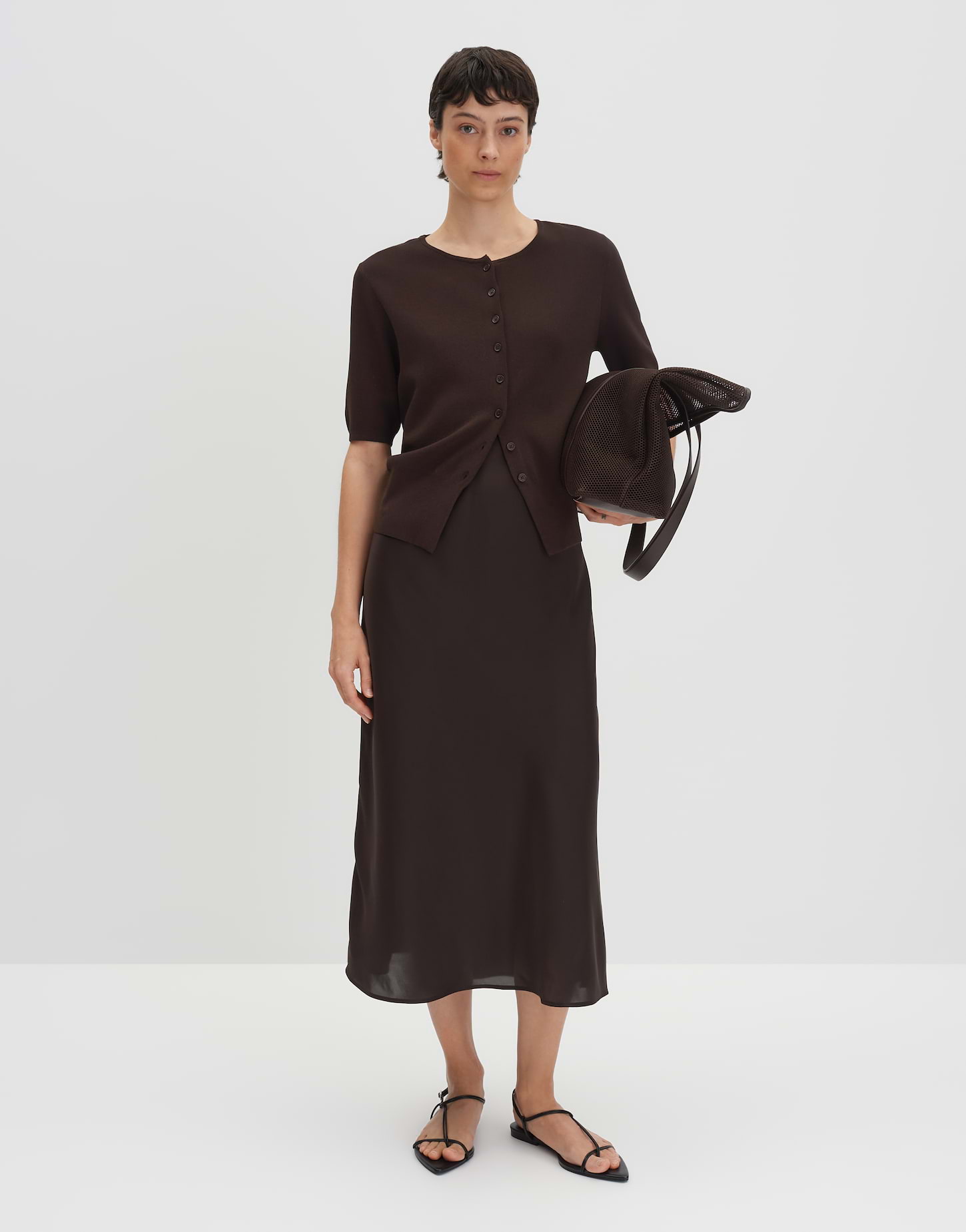 figurbetonte Passform, gerader Schnitt, Halbarm, hoher Rundhalsausschnitt, Rückenlänge ca. 55 cm bei Größe 36, Model Größe 178 cm – trägt Größe 36, Feinstrick, natürlicher Griff, formstabil, breiter Ripp-Saum, Knopfleiste vorn