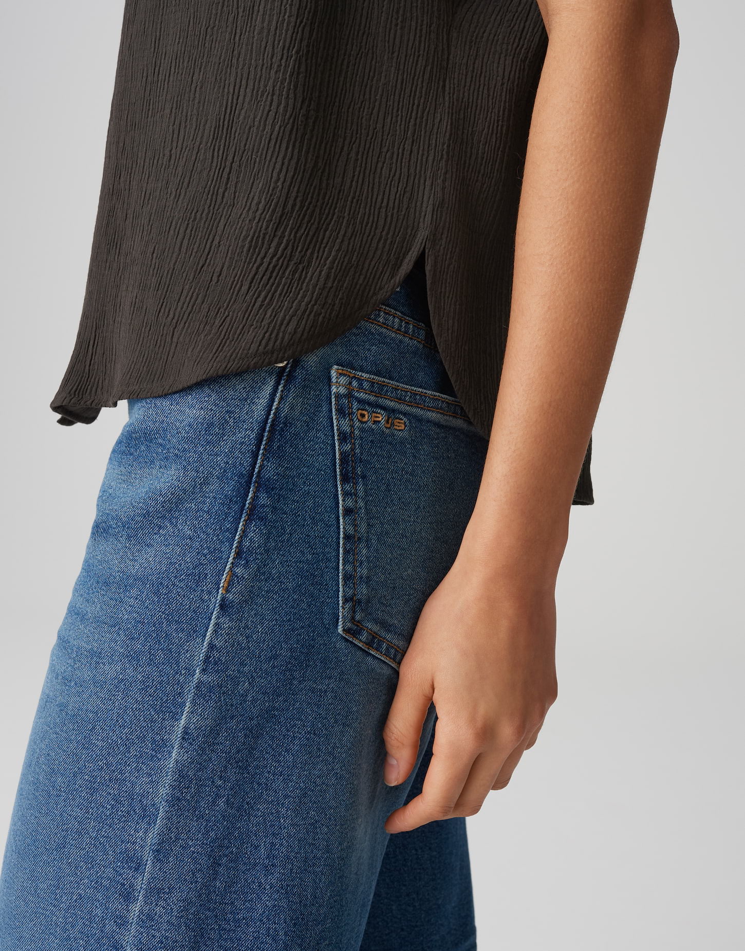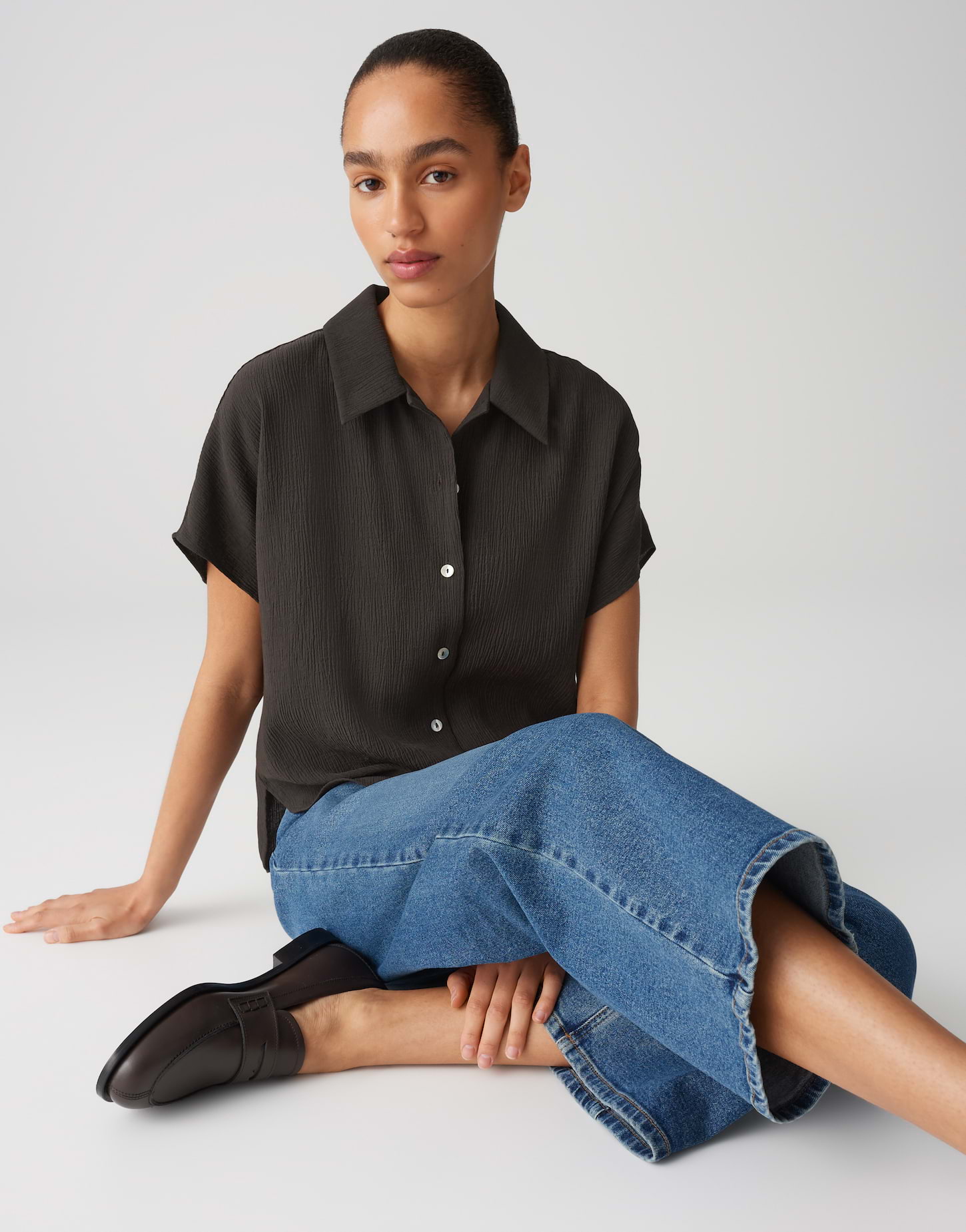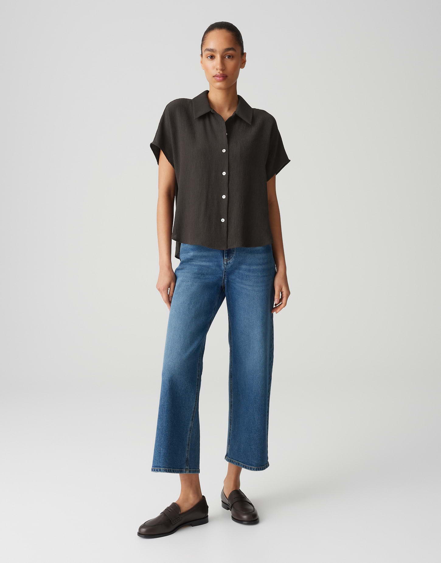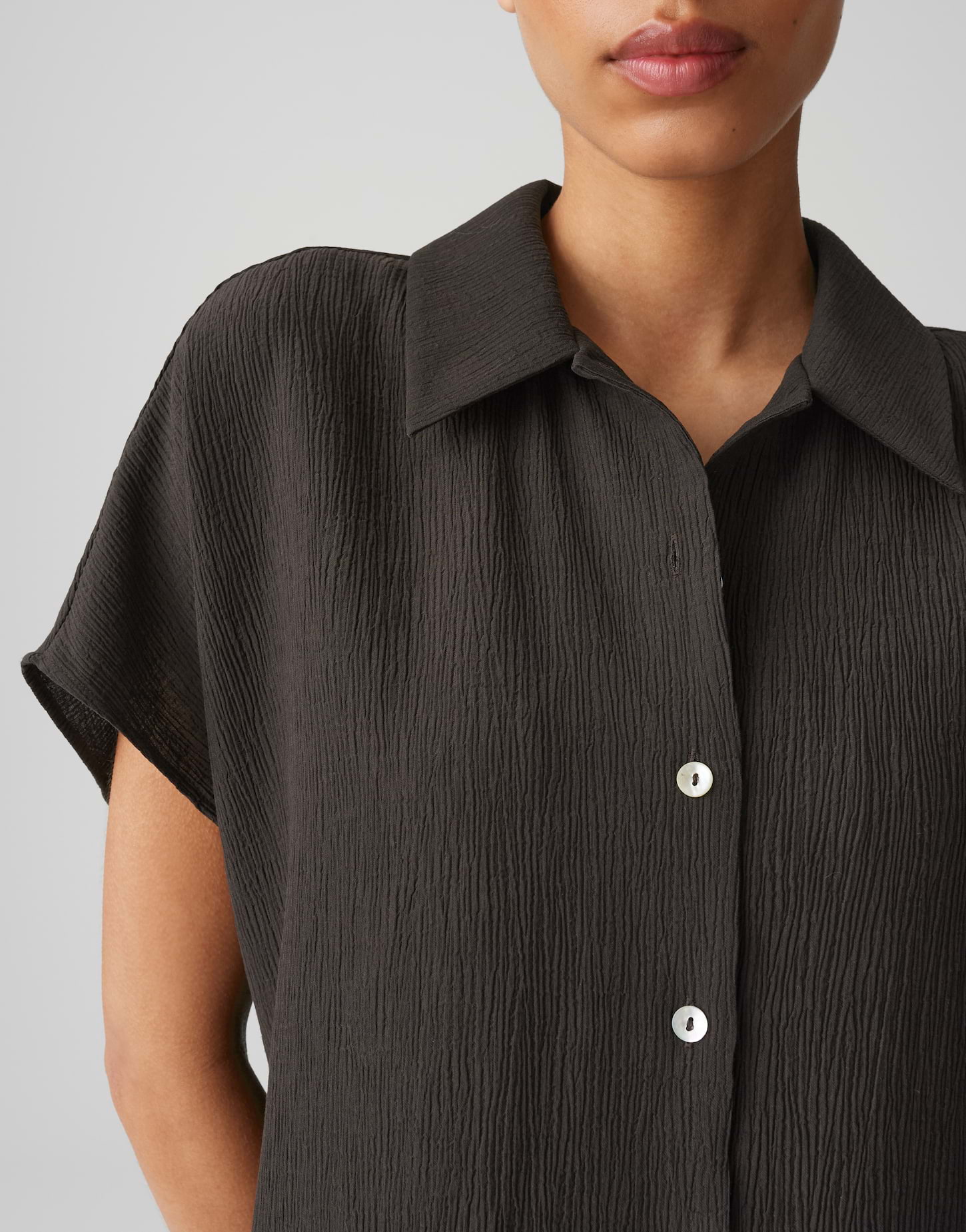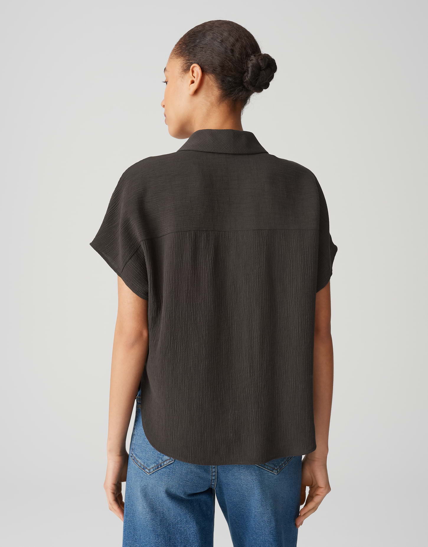 weite Passform, gerader Schnitt, überschnittener Kurzarm, Hemdblusenkragen, Rückenlänge ca. 60 cm bei Größe 36, Farbe midnight brown: Model Größe 177 cm – trägt Größe 36, Farbe olive leaf: Model Größe 172 cm – trägt Größe 36, Webware, enthält nichttextile Teile tierischen Ursprungs, Crinkle Effekt, natürlicher Griff, weich fließender Fall, abgerundeter Saum, Knopfleiste, Perlmuttknöpfe, Passe im Rücken