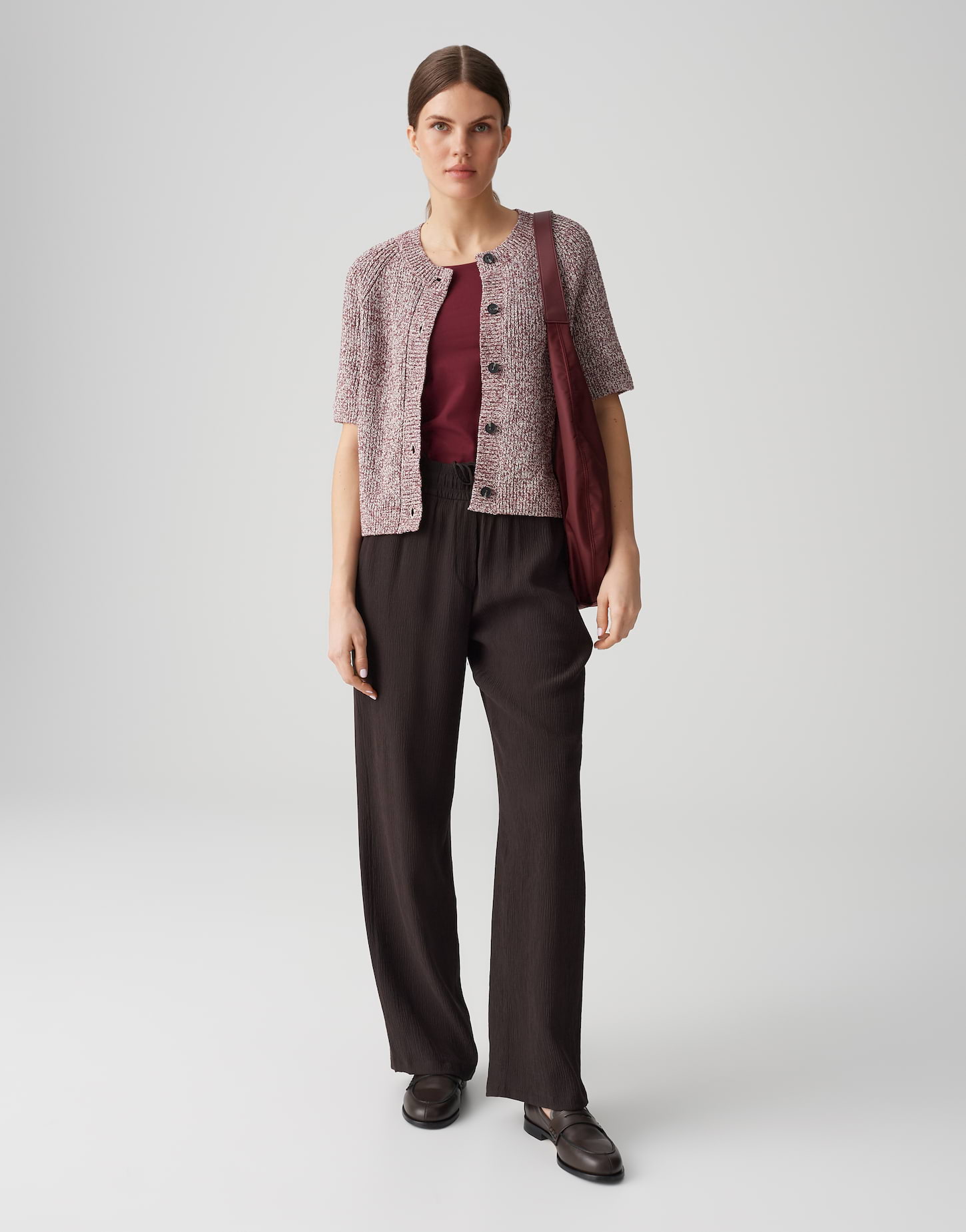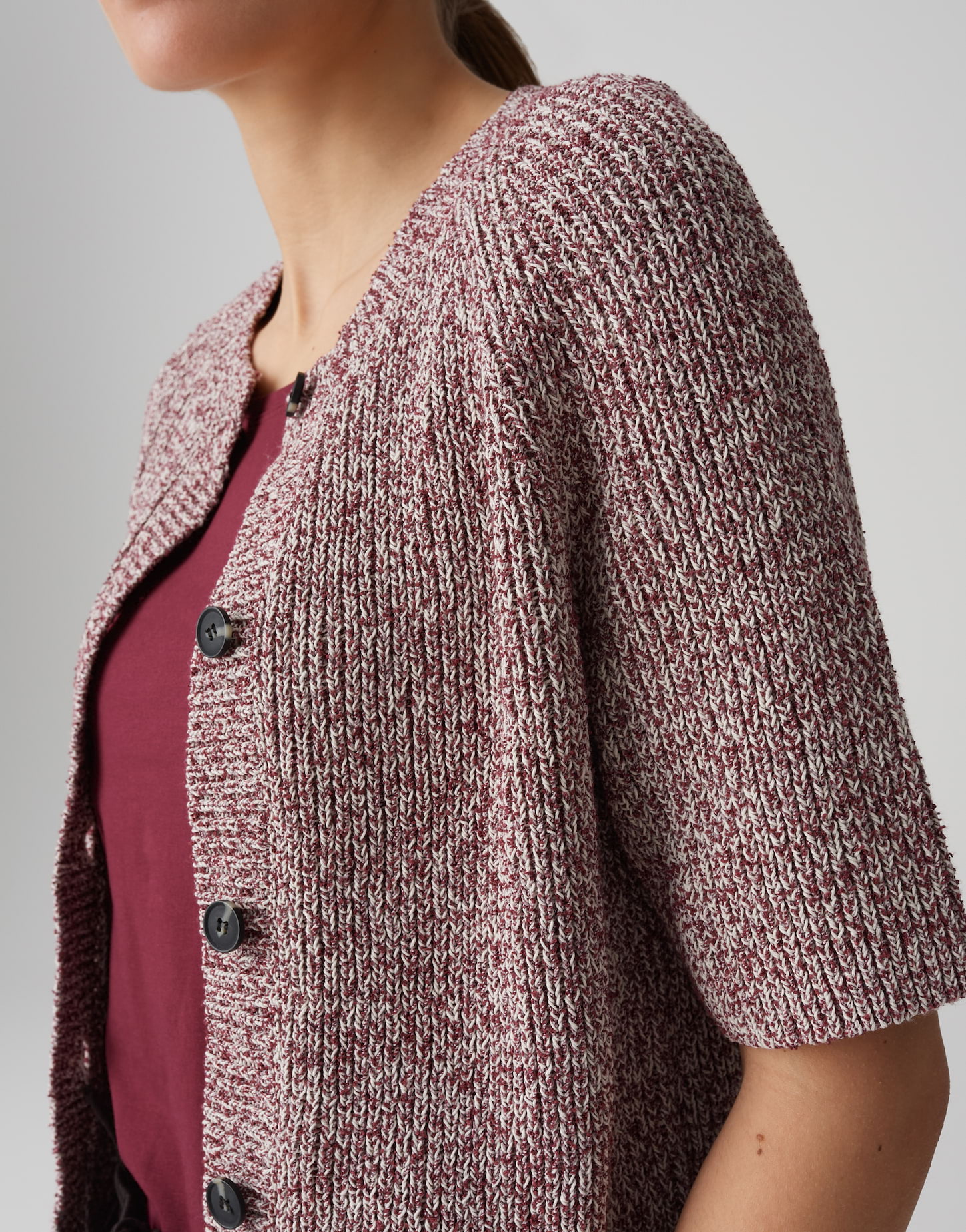schmale Passform, gerader Schnitt, verkürzte Länge, Halbarm mit Raglan, Rundhalsausschnitt, Rückenlänge ca. 52 cm bei Größe 36, Model Größe 175 cm – trägt Größe 36, Strick, natürlicher Griff, fließender Fall, Mouliné Effekt, Strickbündchen, Knopfleiste