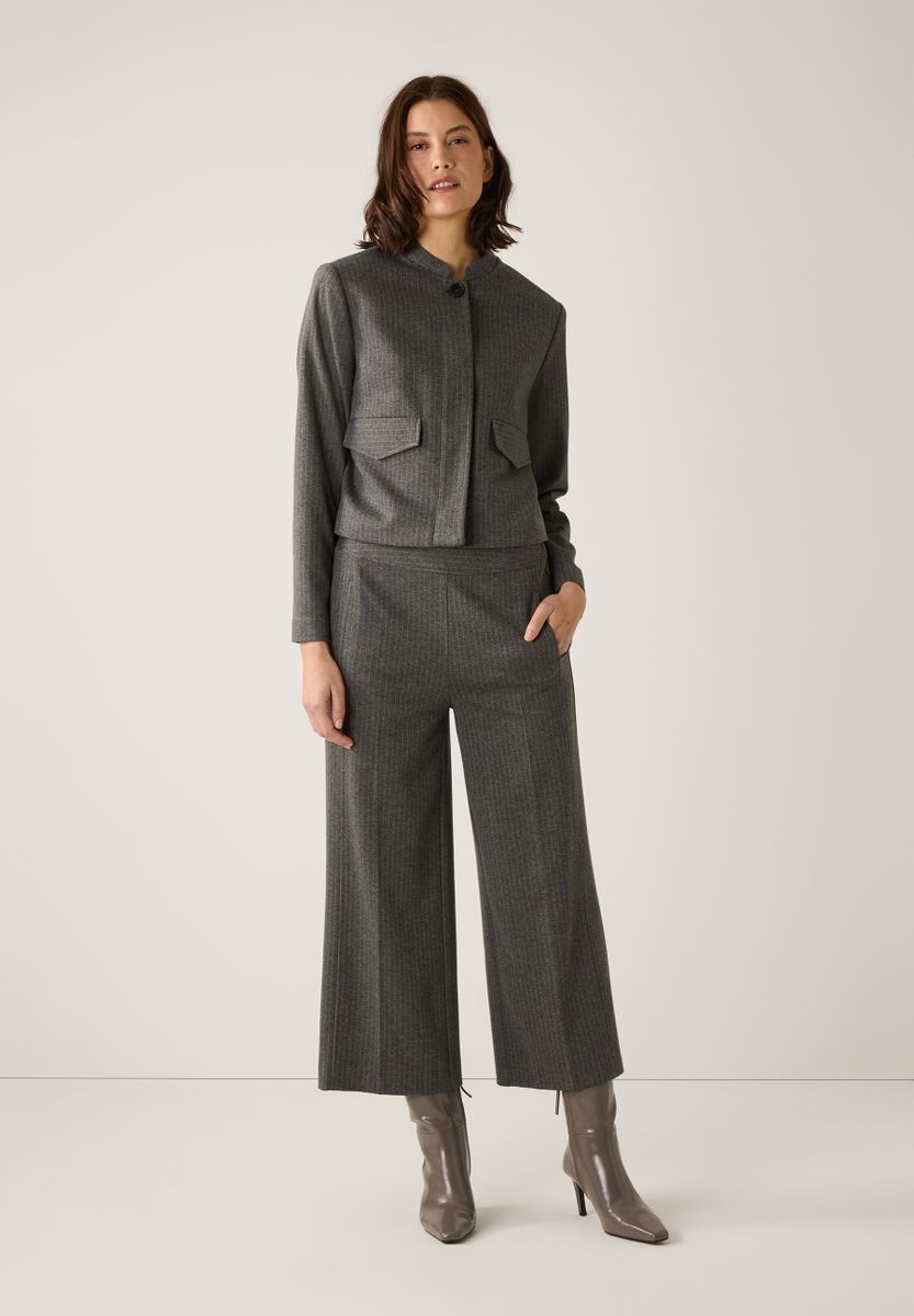 Der kurze Nadelstreifen-Blazer von MORE & MORE ist super-modern mit raffinierter Optik. Der kleine Stehkragen und die verdeckte Knopfleiste mit einem sichtbaren Schließknopf betonen das cleane Design, während das Nadelstreifen-Dessin dem Blazer eine stilvolle Note verleiht.
