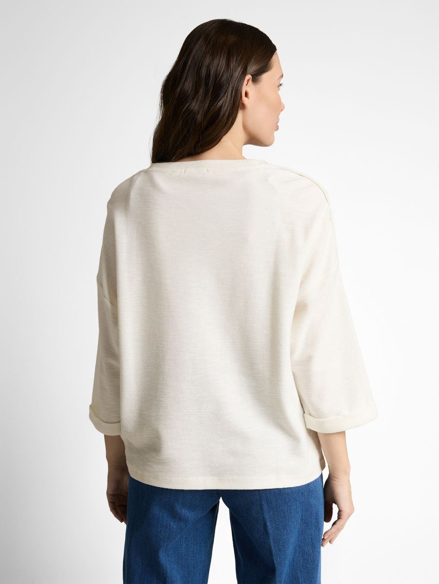 Longsleeve im maritimen Look mit Streifenmuster auf der Vorderseite und Deko-Knopfleiste an den Schultern. Mit fixiertem Ärmelaufschlag am 3/4-Arm. Aus einem strukturierten Jacquard-Stoff mit Baumwolle.