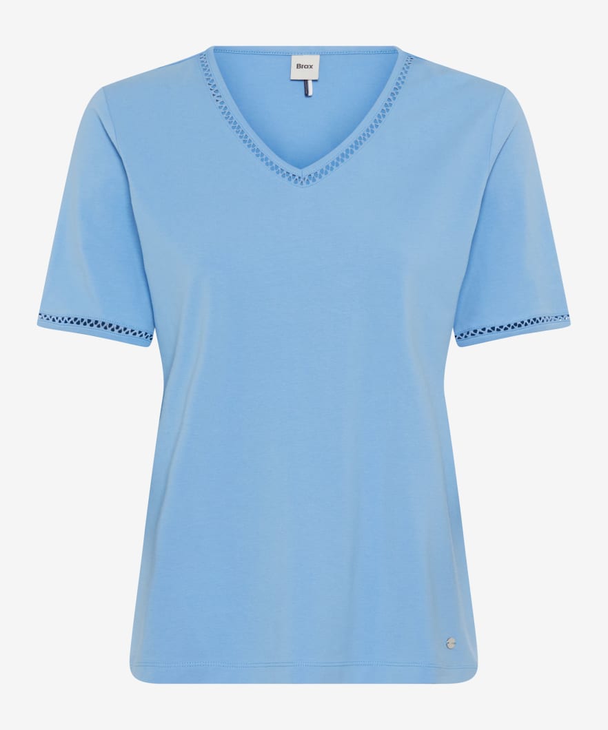 Mit dem T-Shirt im STYLE CARINA starten Sie stilvoll und frisch in die warme Jahreszeit. Dieses moderne Basic für Damen verbindet zeitlose Eleganz mit sommerlicher Leichtigkeit und ist der ideale Begleiter für entspannte Tage. Die leicht taillierte Silhouette unterstreicht gekonnt die feminine Form und sorgt für eine schmeichelhafte Passform, während der V-Ausschnitt für eine dezente, doch stilvolle Akzentuierung sorgt. Besonders charmant sind die feinen Zierbänder am Kragen und den Ärmelabschlüssen, die dem Design eine raffinierte Note verleihen und das Gesamtbild perfekt abrunden. Gefertigt aus einem hochwertigen Cotton-Mix, bietet dieses Single Jersey T-Shirt einen unvergleichlich weichen Griff und eine angenehme Elastizität. Die Kombination aus hautfreundlicher Baumwolle und formstabilem Elasthan sorgt nicht nur für ein angenehmes Tragegefühl, sondern auch für optimale Bewegungsfreiheit, sodass Sie den ganzen Tag über höchsten Komfort genießen können. Dieses Kleidungsstück vereint Qualität, Stil und Alltagstauglichkeit und wird so zu einem unverzichtbaren Favoriten in Ihrer Sommergarderobe.