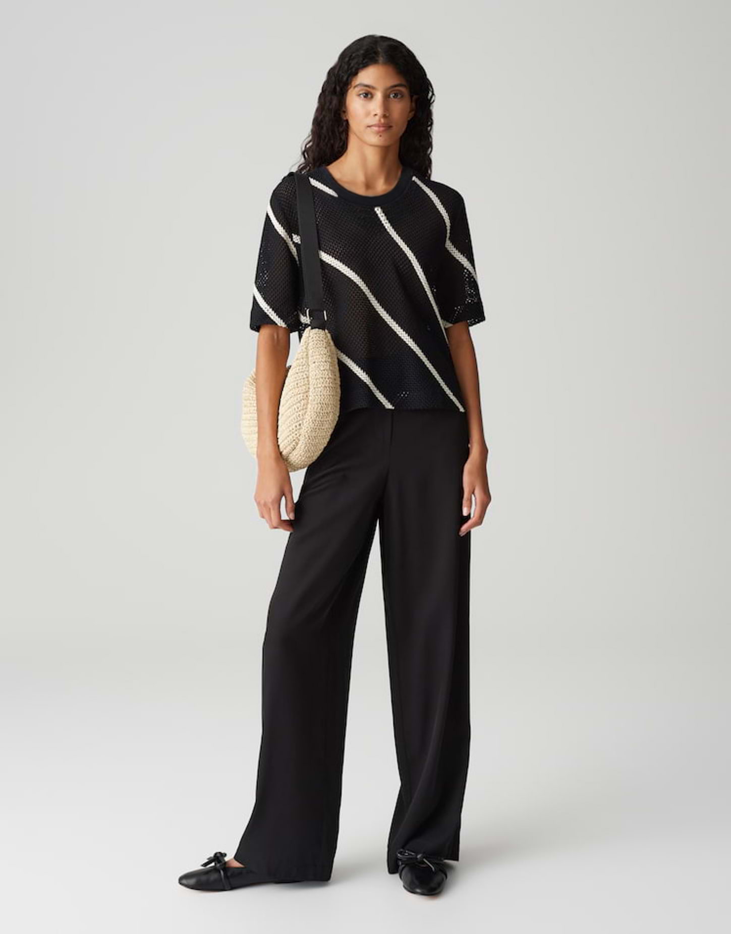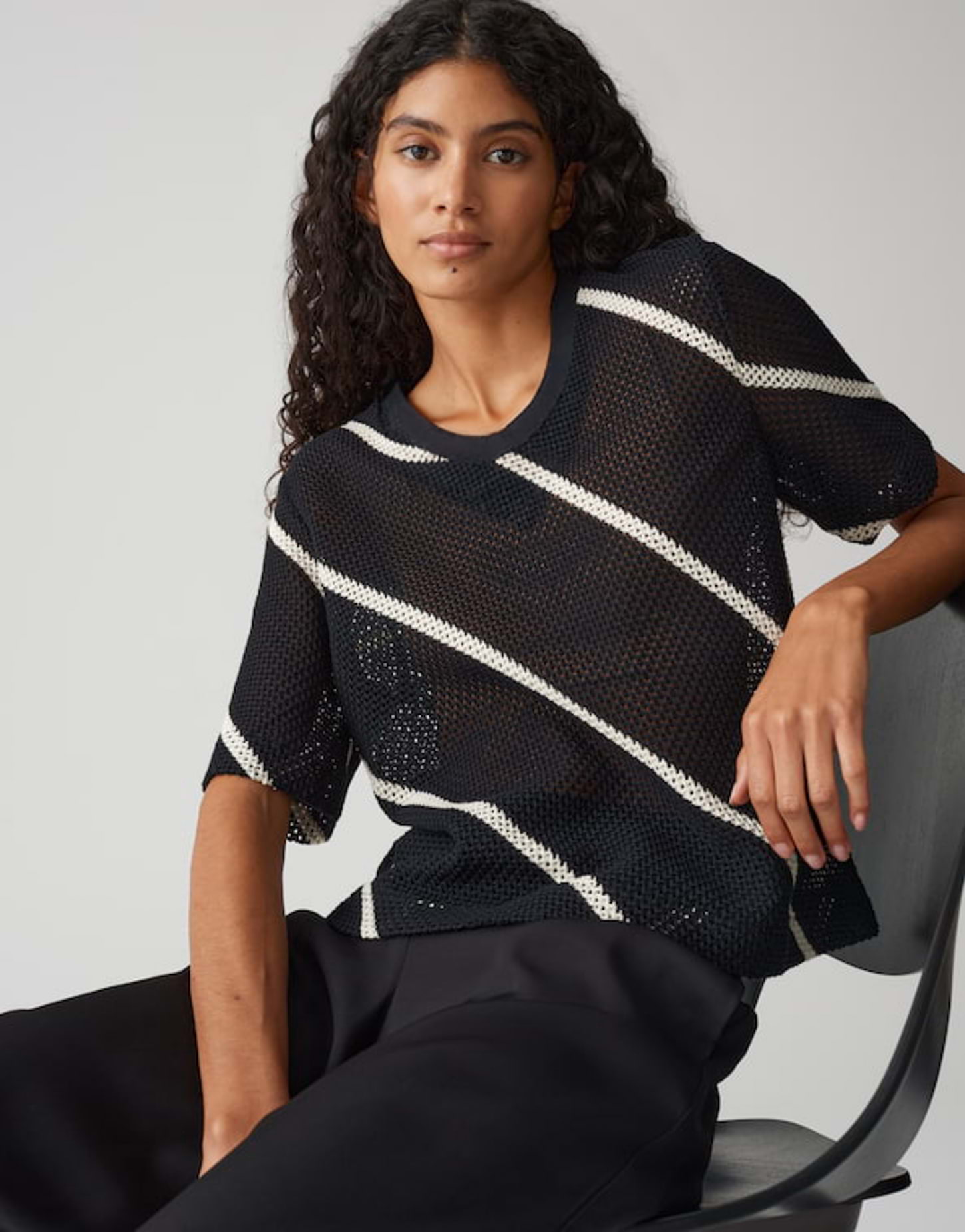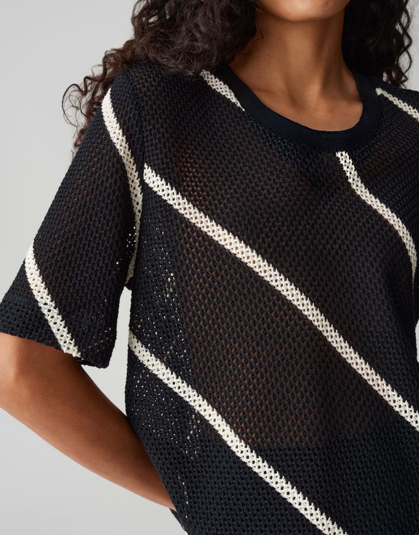 lockere Passform, gerader Schnitt, leicht verkürzt geschnitten, Halbarm, Rundhalsausschnitt, Rückenlänge ca. 56 cm bei Größe 36, Model Größe 176 cm – trägt Größe 36, Sweatware, Häkeloptik, fester Griff, leichte Transparenz, formstabil, diagonales Streifenmuster, Rippbündchen am Halsloch