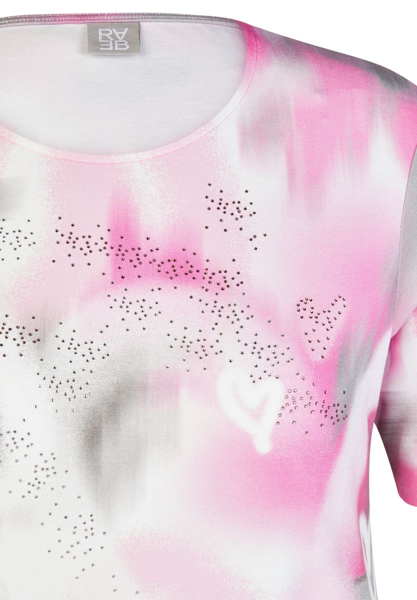 Dieses Shirt verbindet eine moderne Batik-Optik mit funkelnden Strassdetails im Frontbereich. Der elastische Saum mit seitlichem Tunnelzug sorgt für eine feminine Silhouette und einen lässigen Sitz. Die Materialmischung aus Baumwolle und Modal fühlt sich besonders weich an und liegt angenehm auf der Haut, während der Elasthan-Anteil für zusätzlichen Komfort und Bewegungsfreiheit sorgt. Weicher Griff. Strassdetails vorne. Tunnelzug am Saum.