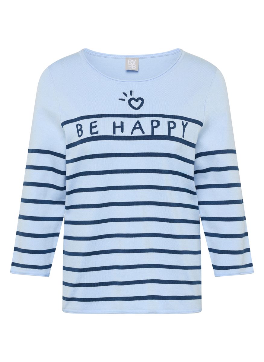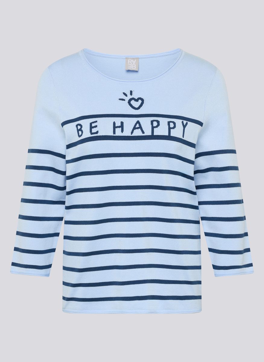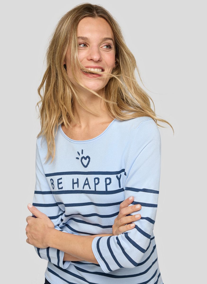 Dieses Shirt überzeugt mit seiner klaren Streifenoptik und einem verspielten Message-Schriftzug im Brustbereich. Der Rundhalsausschnitt und die 3/4-Ärmel unterstreichen den legeren Look. Die weiche Strickqualität sorgt für angenehmen Tragekomfort und macht das Modell zu einem vielseitigen Kombipartner im Alltag _ ideal zu Jeans, Chinos oder Röcken. Weiche, formstabile Strickqualität. Rundhalsausschnitt. Dreiviertelärmel. Kombinierfreudiges Ringeldesign. Mit platziertem Schriftzug „Be Happy“.