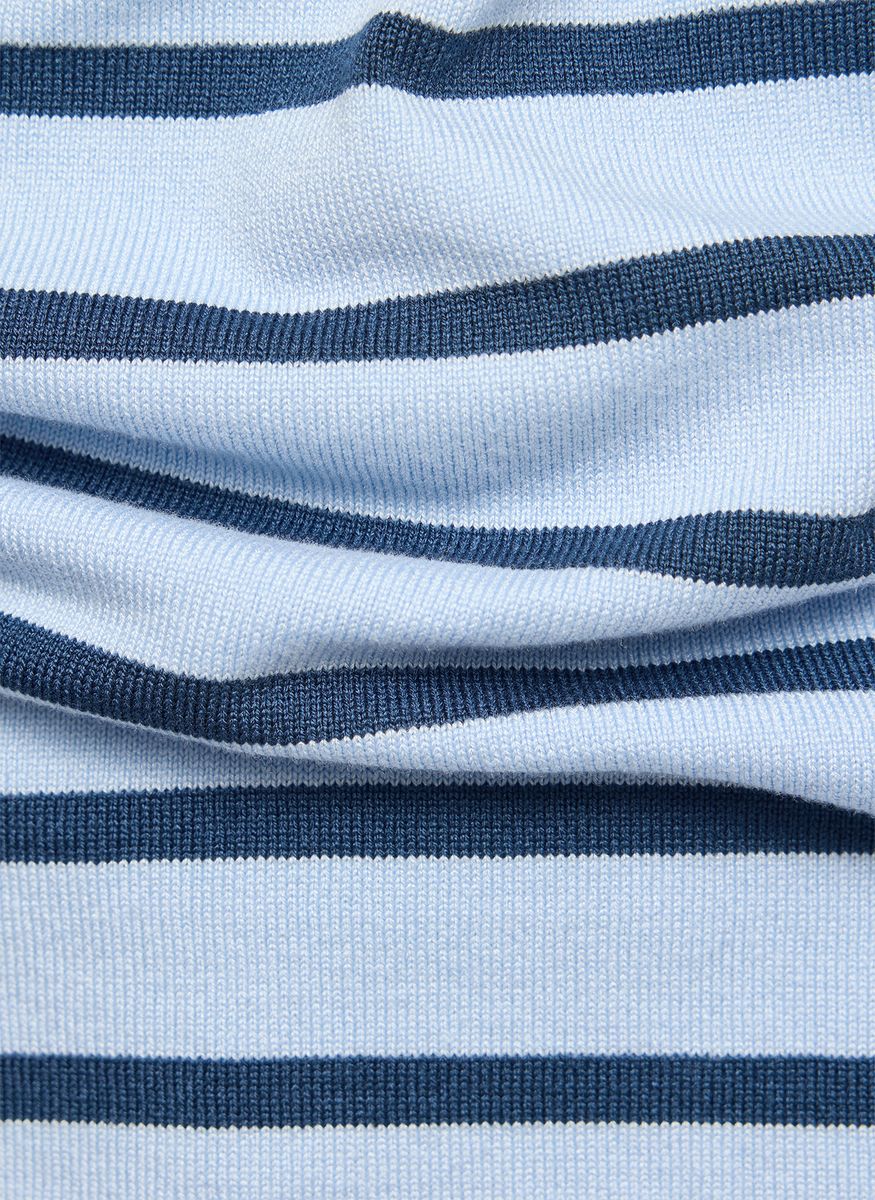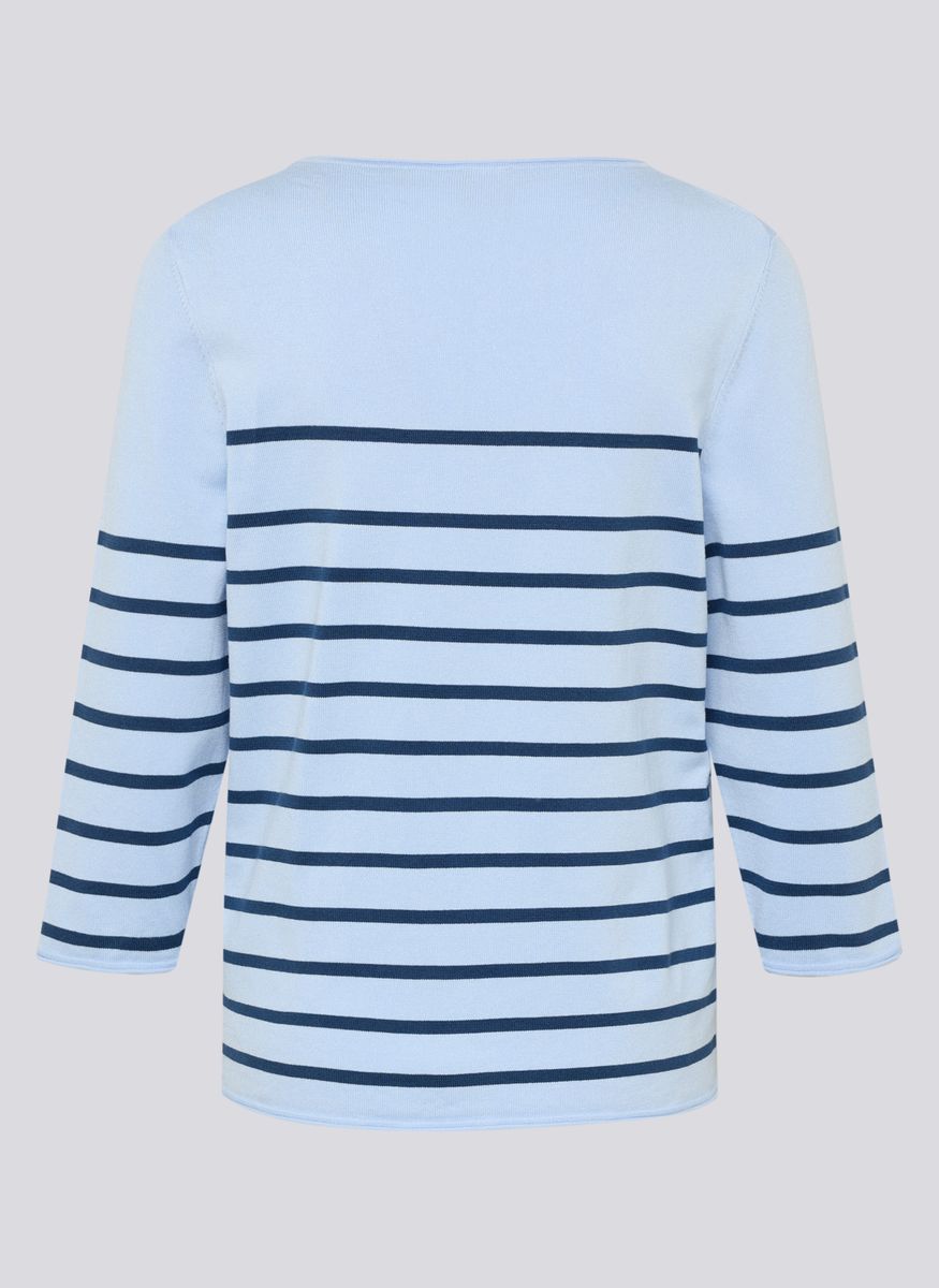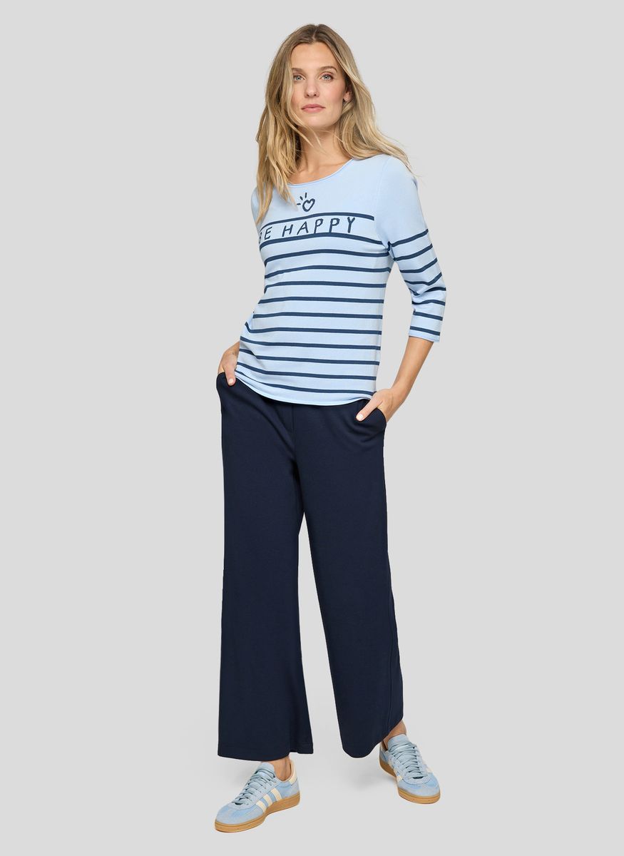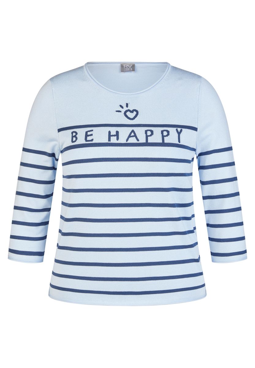 Dieses Shirt überzeugt mit seiner klaren Streifenoptik und einem verspielten Message-Schriftzug im Brustbereich. Der Rundhalsausschnitt und die 3/4-Ärmel unterstreichen den legeren Look. Die weiche Strickqualität sorgt für angenehmen Tragekomfort und macht das Modell zu einem vielseitigen Kombipartner im Alltag _ ideal zu Jeans, Chinos oder Röcken. Weiche, formstabile Strickqualität. Rundhalsausschnitt. Dreiviertelärmel. Kombinierfreudiges Ringeldesign. Mit platziertem Schriftzug „Be Happy“.