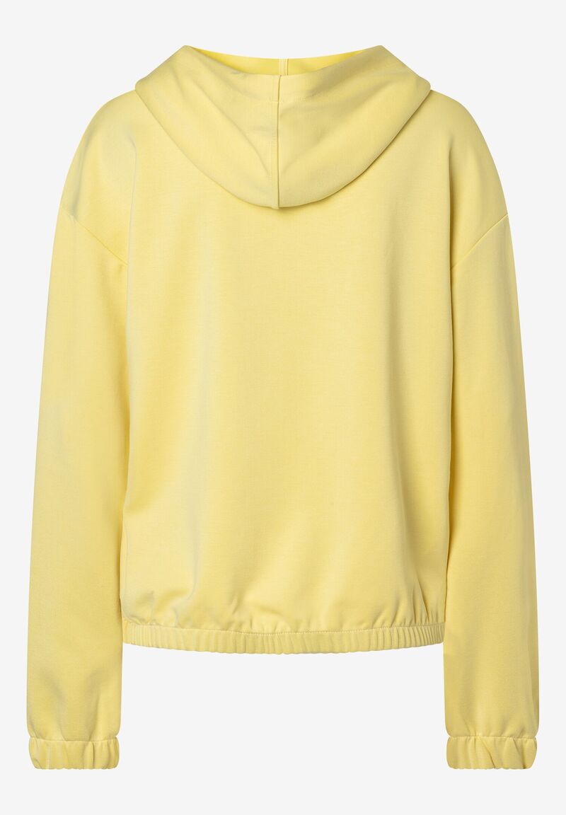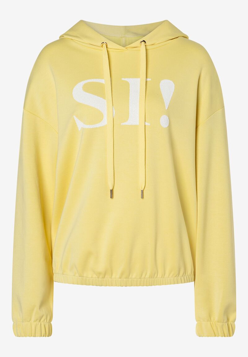 Das super-softe Sweatshirt von MORE & MORE mit weißer Perlchenaufschrift sieht zum bunten Chiffonrock genauso gut aus wie zur used Denim.