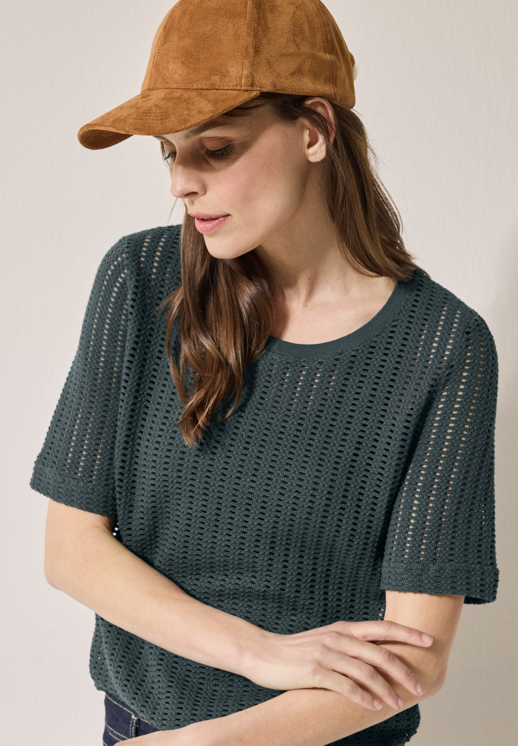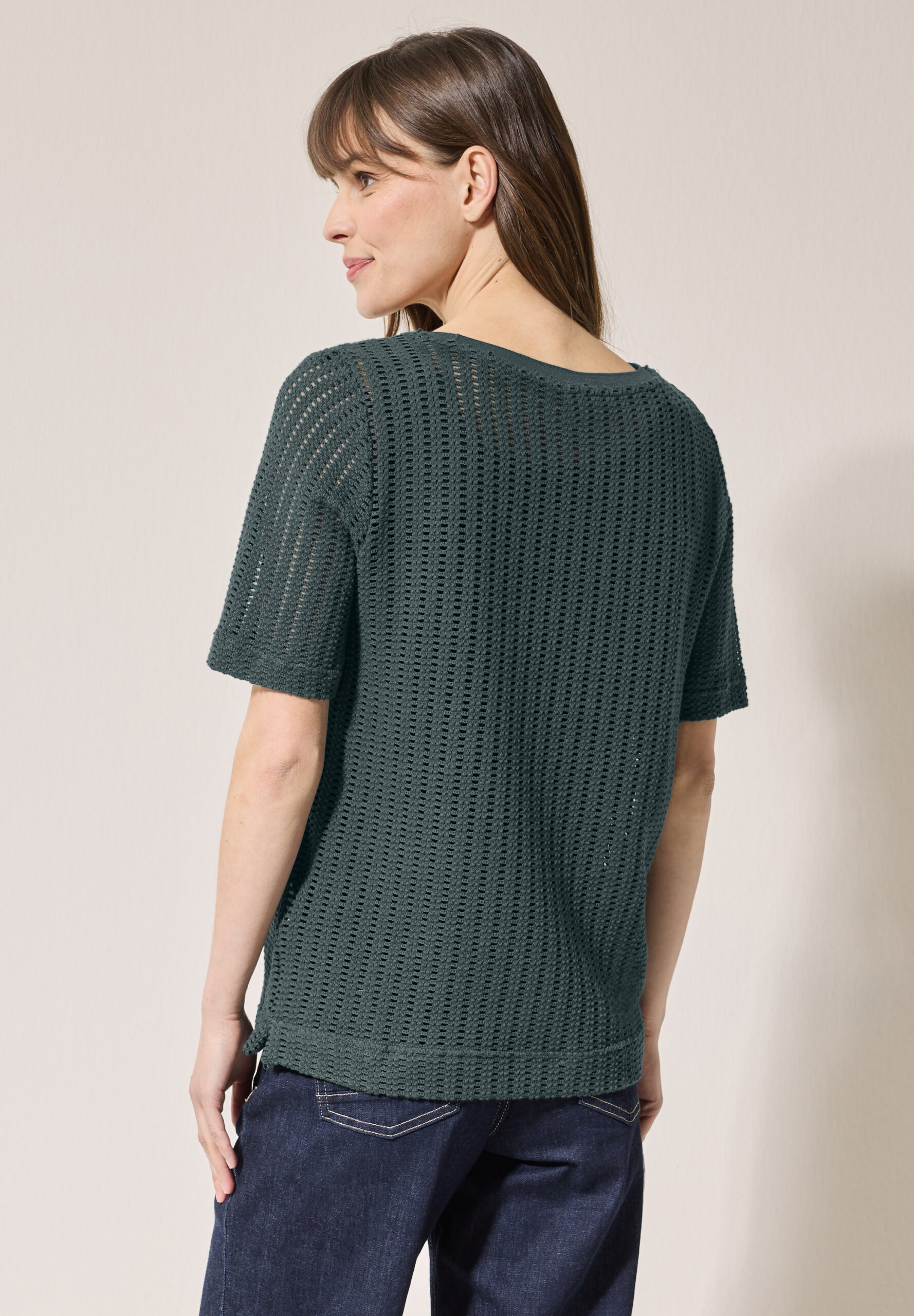Das Ajour T-Shirt von CECIL für Damen setzt mit seiner feinen Strickstruktur und dem dezenten Lochmuster modische Akzente. Der klassische Rundhalsausschnitt und die kurzen Ärmel sorgen für eine zeitlose Optik. Seitliche Schlitze im Saum verleihen Bewegungsfreiheit und eine luftige Passform. Shirt mit seitlichen Schlitzen im Saum Rundhalsausschnitt Kurzarm Strickstruktur mit Lochmuster Baumwollmix mit Stretchanteil Material: 97% Baumwolle, 3% Elasthan