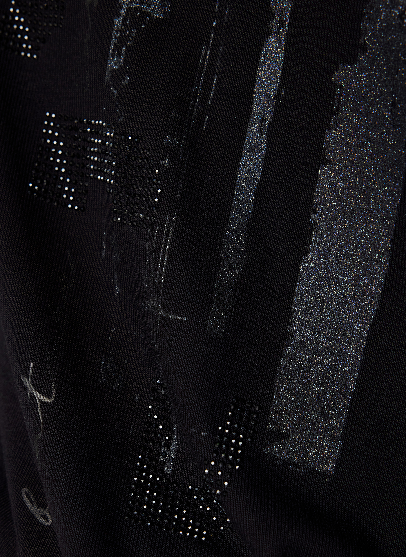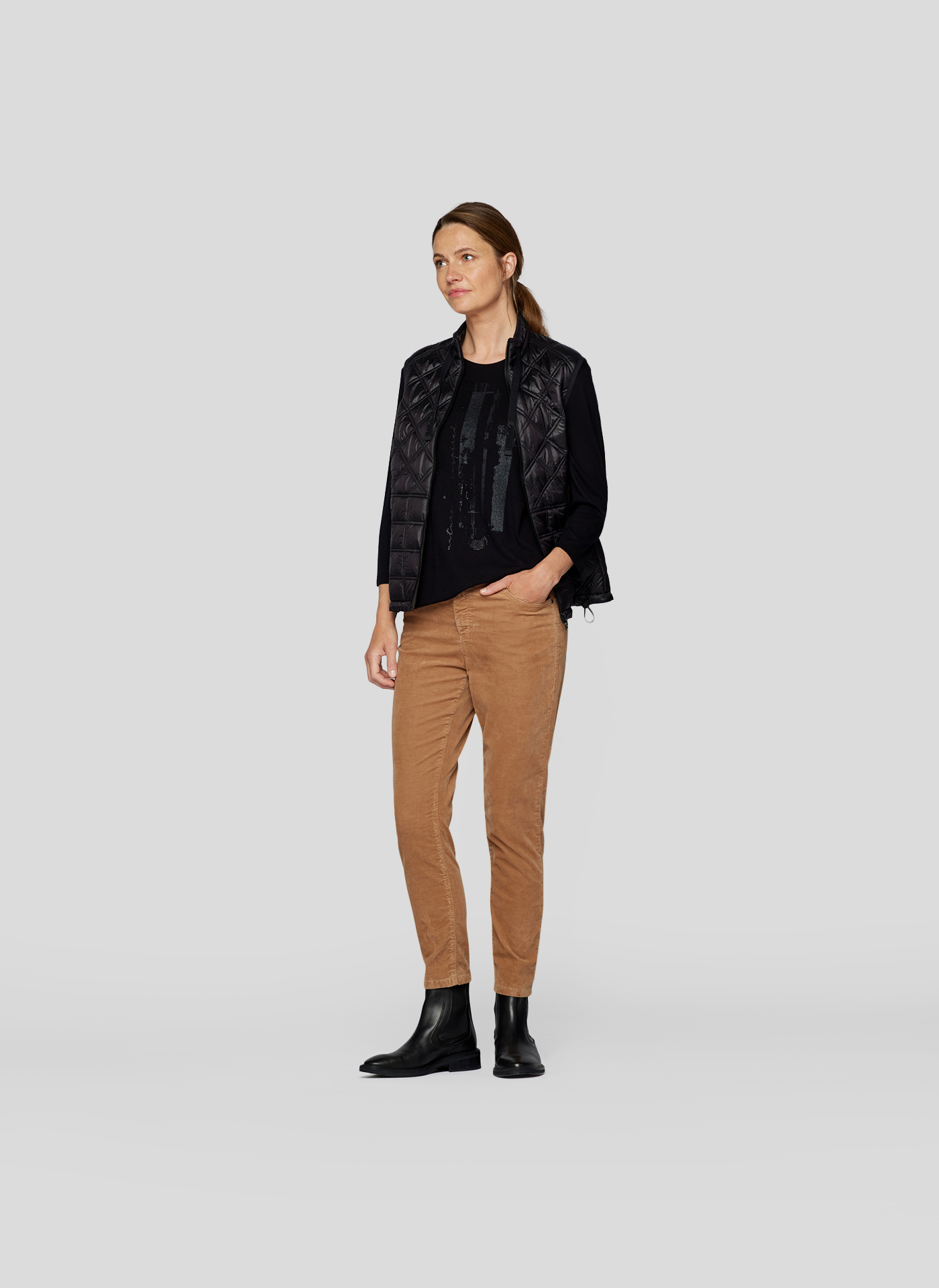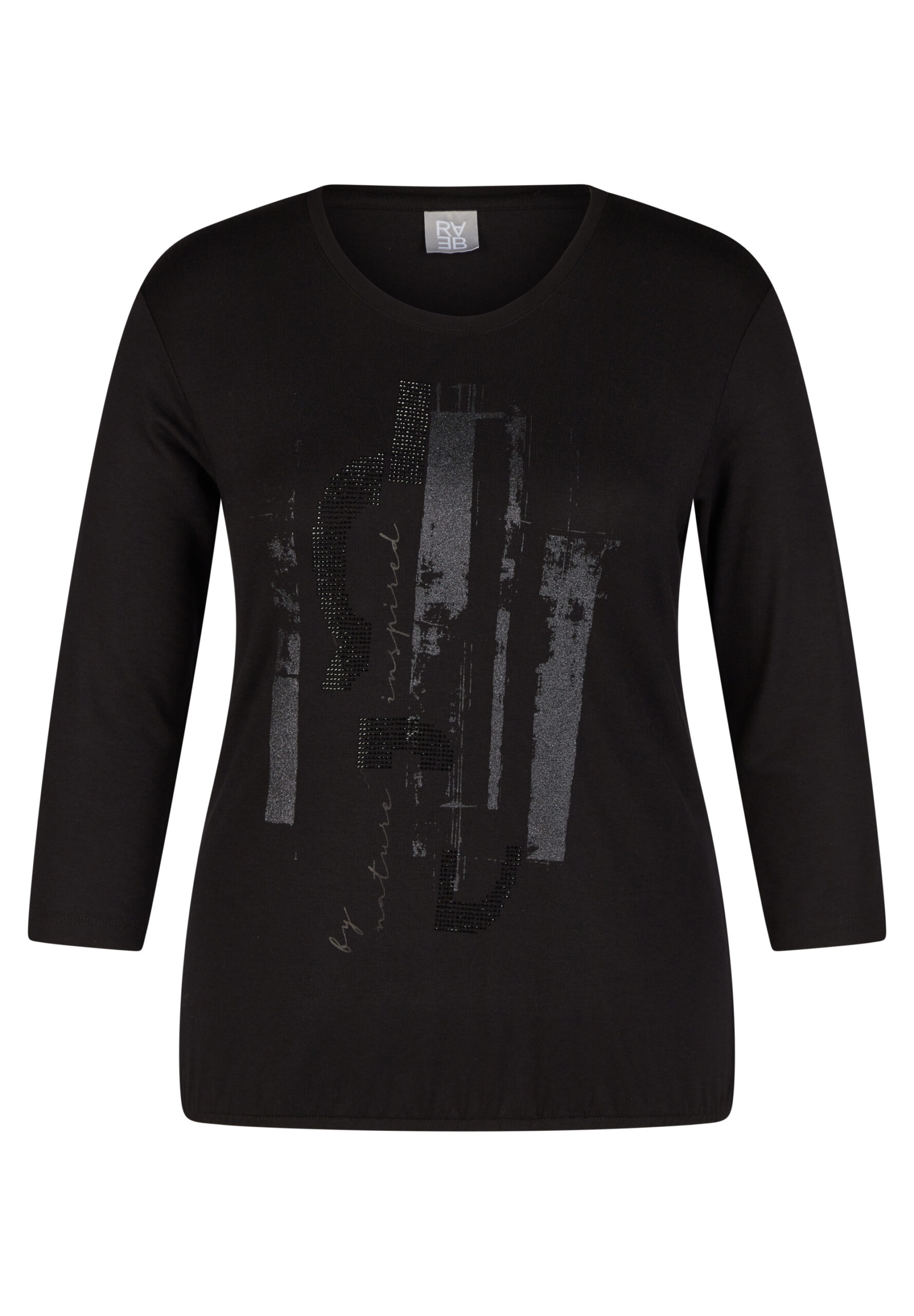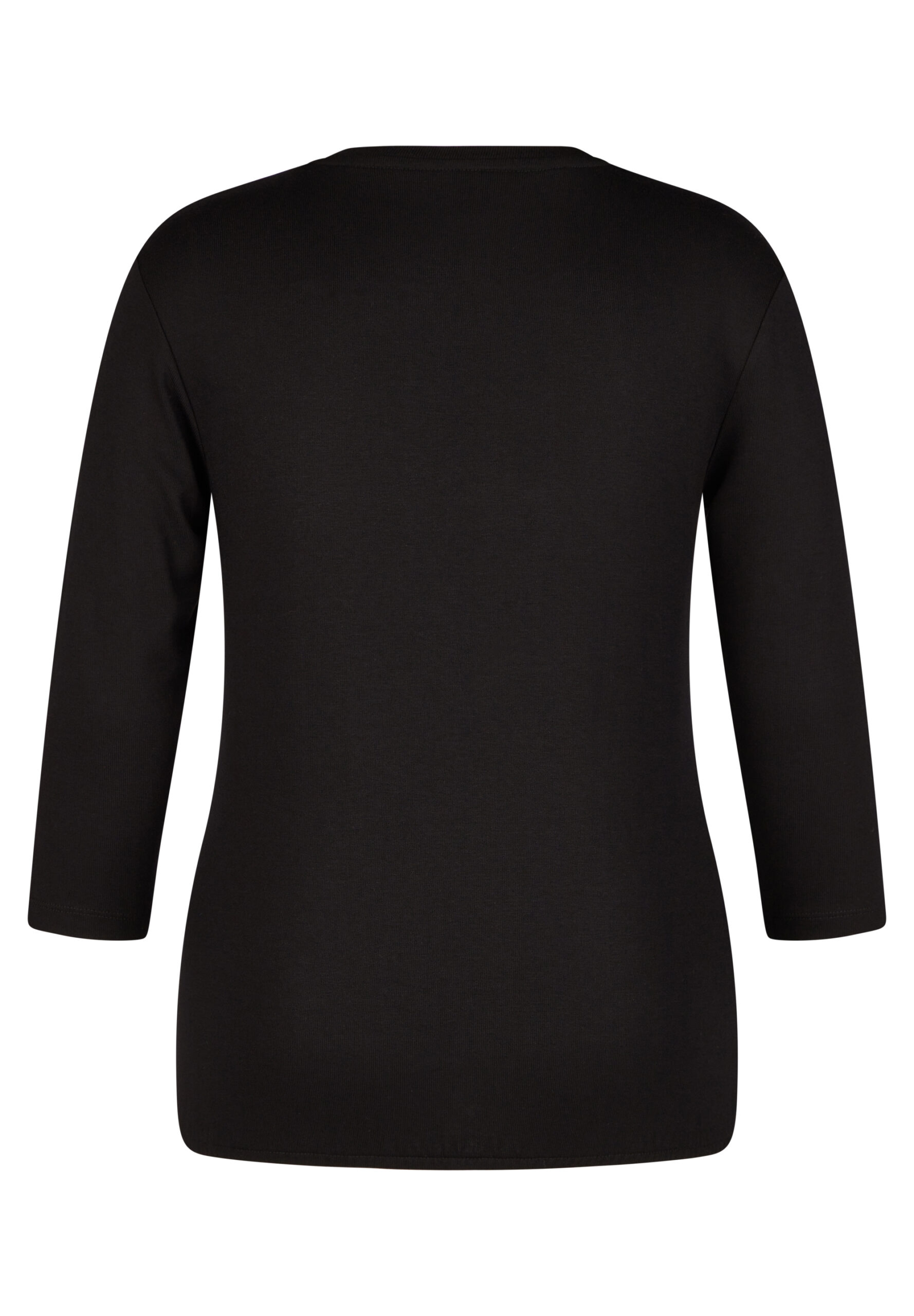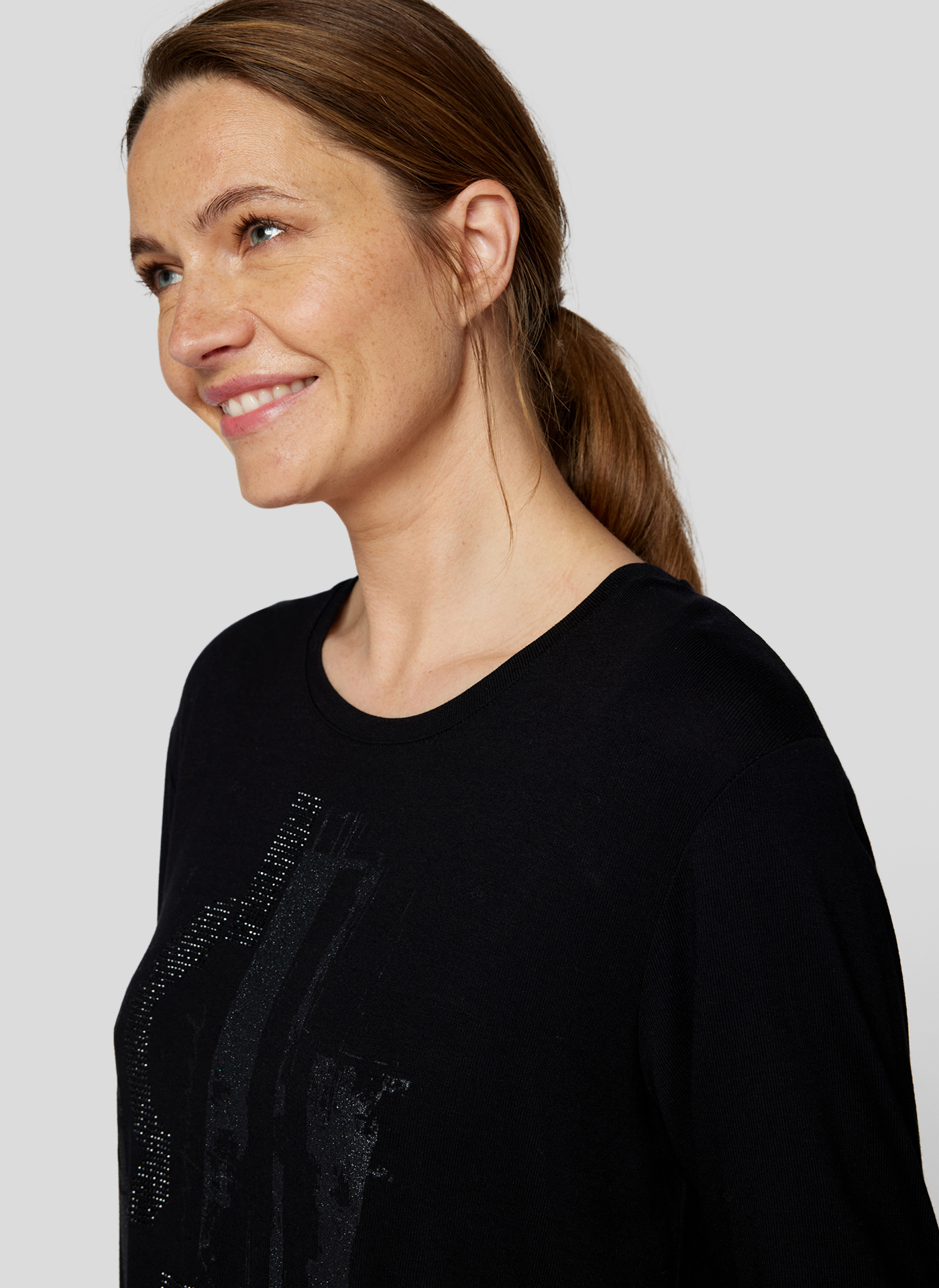 Das schwarze Rundhals-T-Shirt aus 95 % Viskose und 5 % Elastan begeistert durch seinen taillierten Schnitt und die überschnittenen Schultern, die eine feminine Silhouette zaubern. Die 3/4-Ärmel sorgen für einen modischen Look, während das gleichfarbige Statement-Print mit Applikationen dem Design einen glamourösen Akzent verleiht. Ideal für die kühleren Herbsttage, lässt sich dieses vielseitige T-Shirt mühelos zu verschiedenen Outfits kombinieren und wird somit zum unverzichtbaren Begleiter in Ihrer Garderobe.
