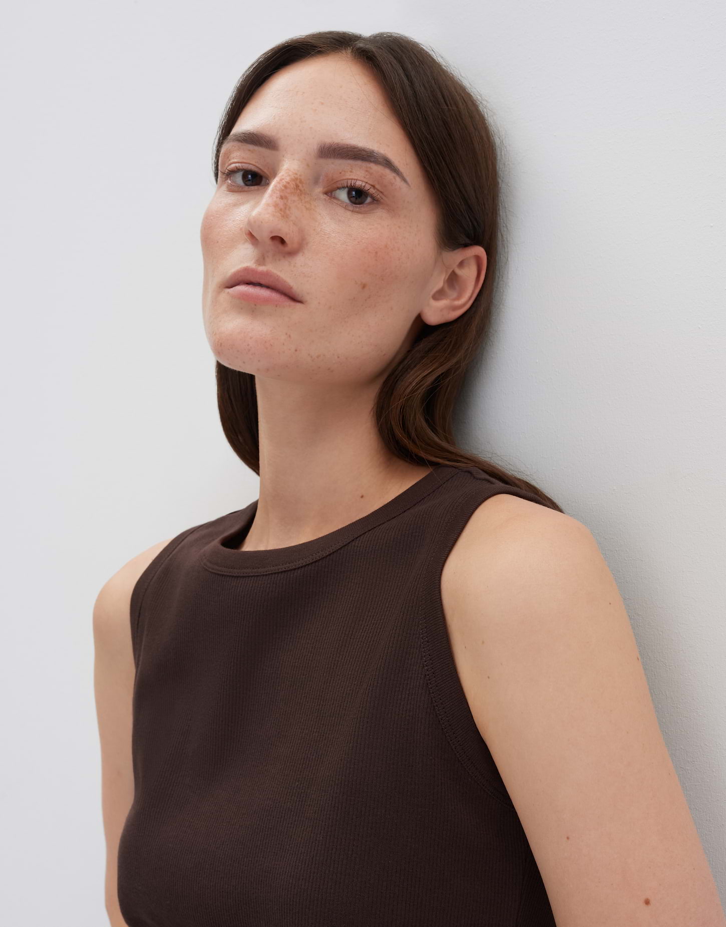 schmale Passform, figurbetont geschnitten, normale Länge, Nullarm, Rundhalsausschnitt, Rückenlänge ca. 60 cm bei Größe 36, BCI Cotton Mix, Jersey, Rippstruktur, elastischer Stoff