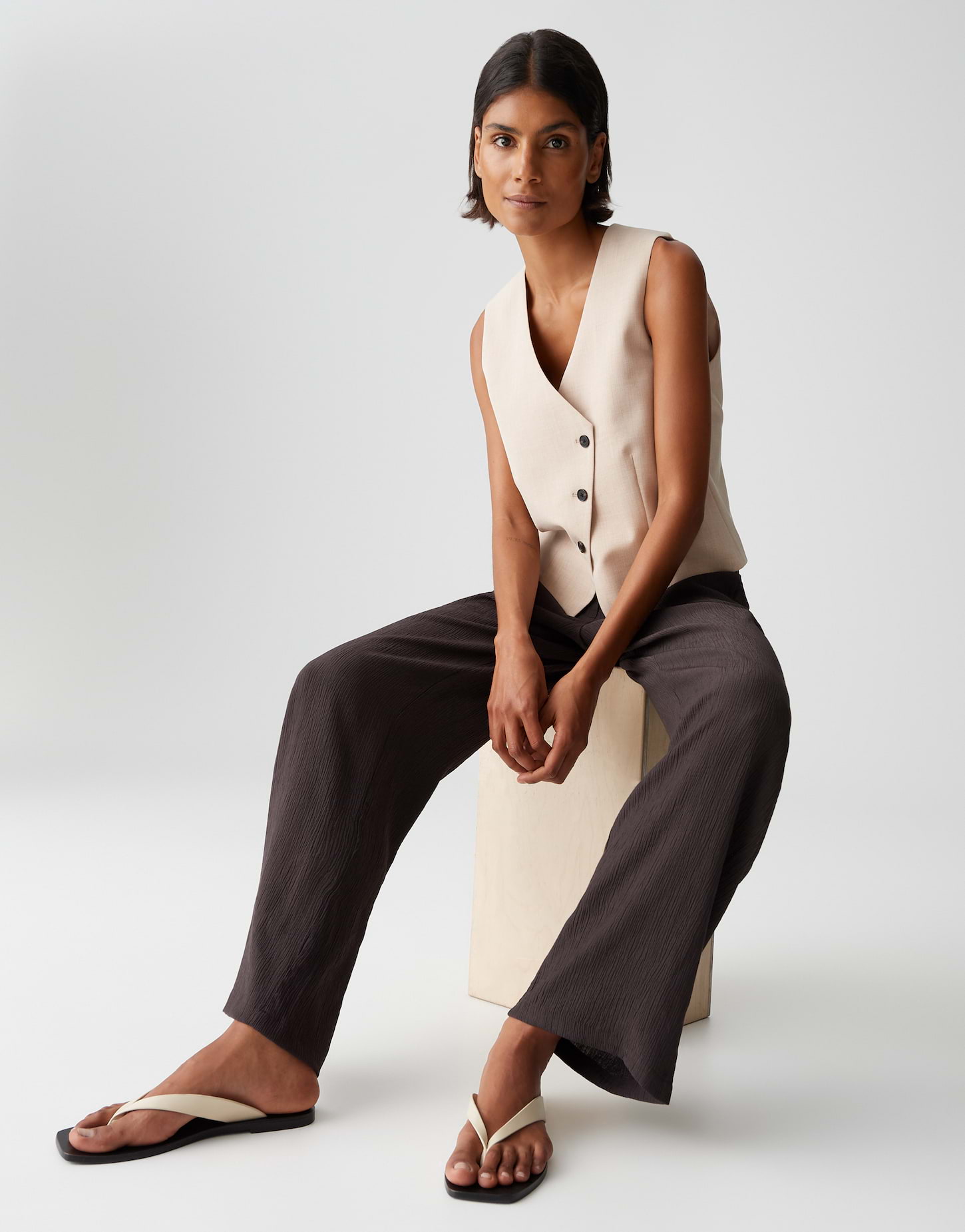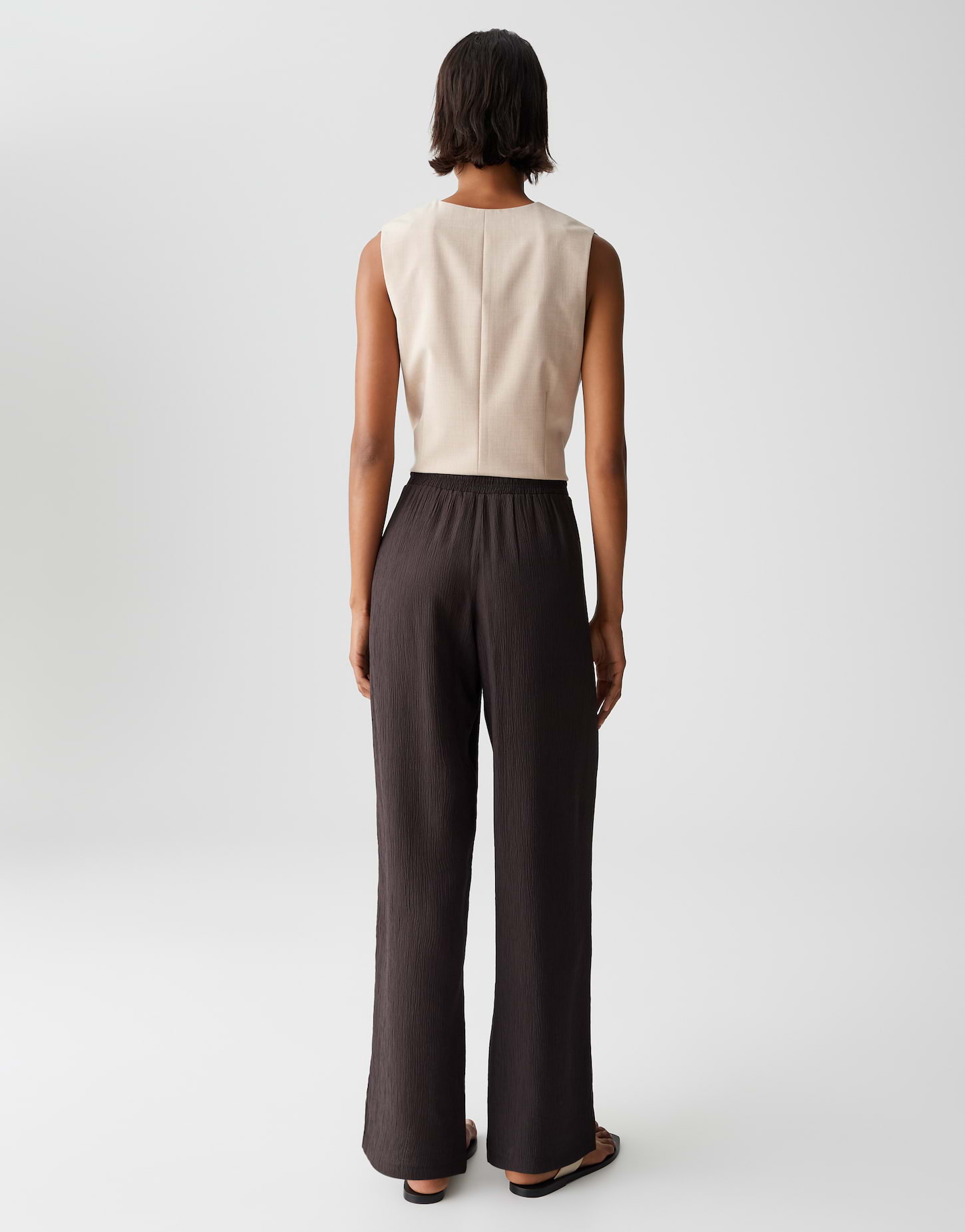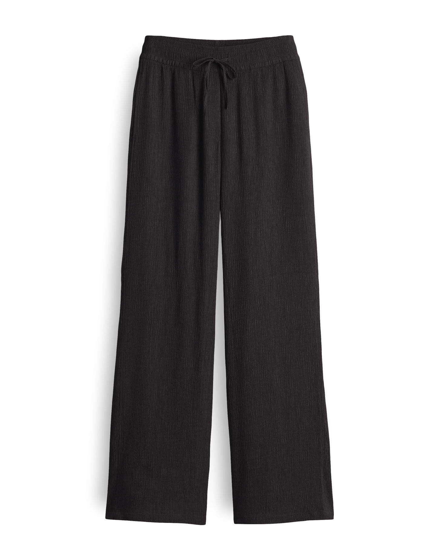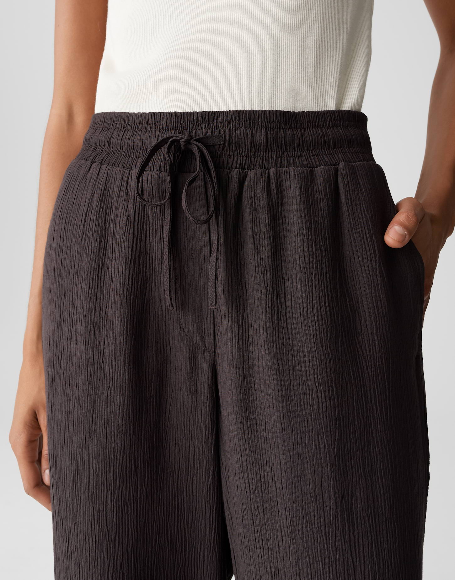 weiter, gerader Beinverlauf, Hosenbein Innenlänge ca. 81 cm in jeder Größe, Model Größe 175 cm – trägt Größe 36, Webware, Crinkle Effekt, natürlicher Griff, elastischer Stoff, fließender Fall, französische Eingrifftaschen, elastischer Gummibund, Kordel zum Binden
